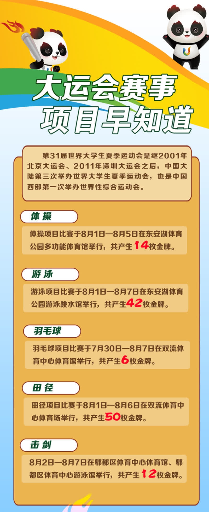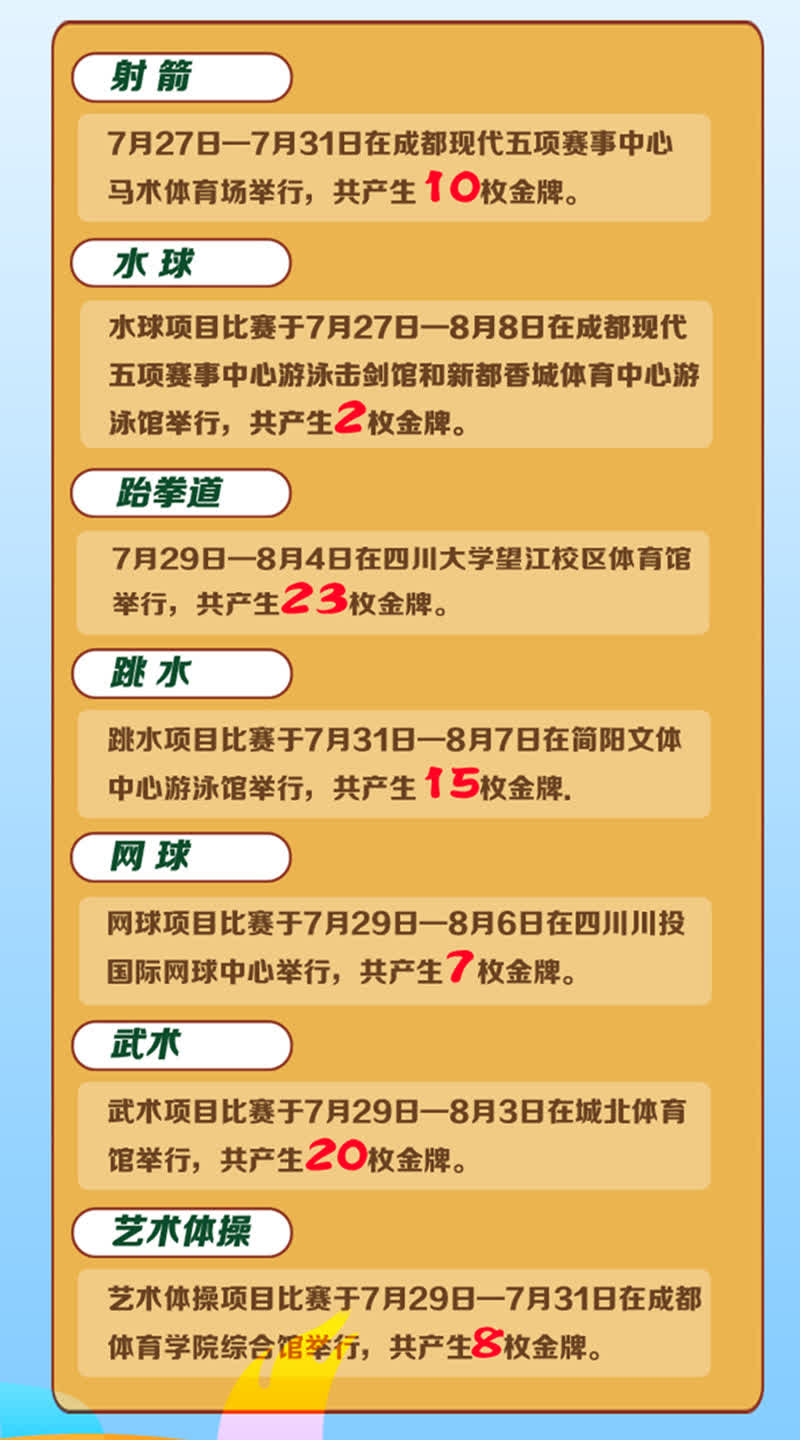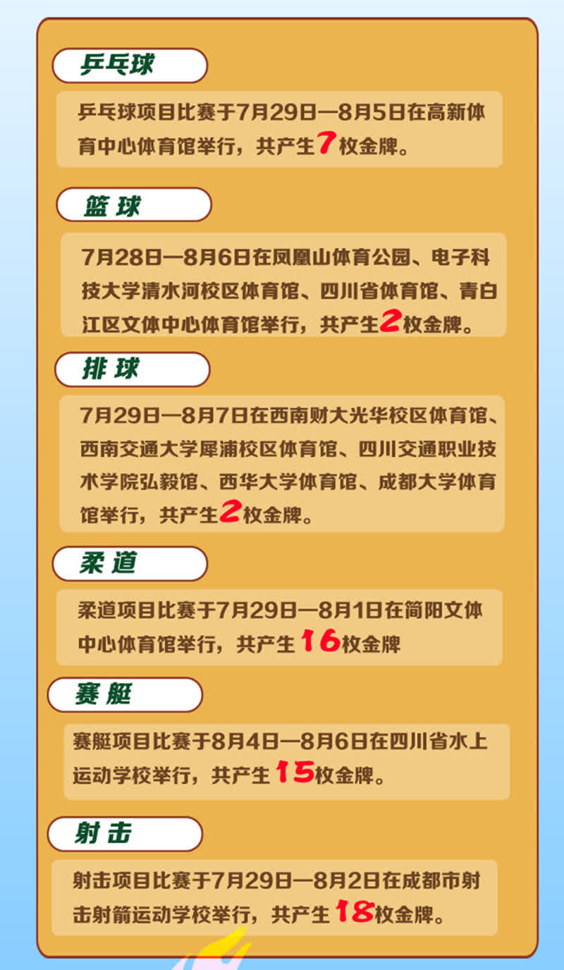 第31屆世界大學生夏季運動會是繼2001年北京大運會、2011年深圳大運會之後,中國大陸第三次舉辦世界大學生夏季運動會,也是中國西部第一次舉辦世界性綜合運動會。乒乓球、田徑、羽毛球、籃球、跳水、游泳……對哪些項目感興趣?這些項目何時何地開賽?小編帶你一分鐘了解詳情。