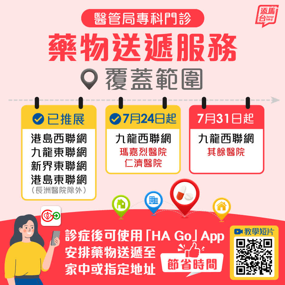 醫管局推出藥物送遞服務,為專科門診的到診病人提供多一個取藥方式,病人可透過局方的流動應用程式「HA Go」,選擇送藥到家中或指定地址。政府表示,醫管局已於港島西聯網、九龍東聯網、新界東聯網及港島東聯網(長洲醫院除外)推行藥物送遞服務,這兩星期更進一步分階段擴展至九龍西聯網的所有專科門診診所。
