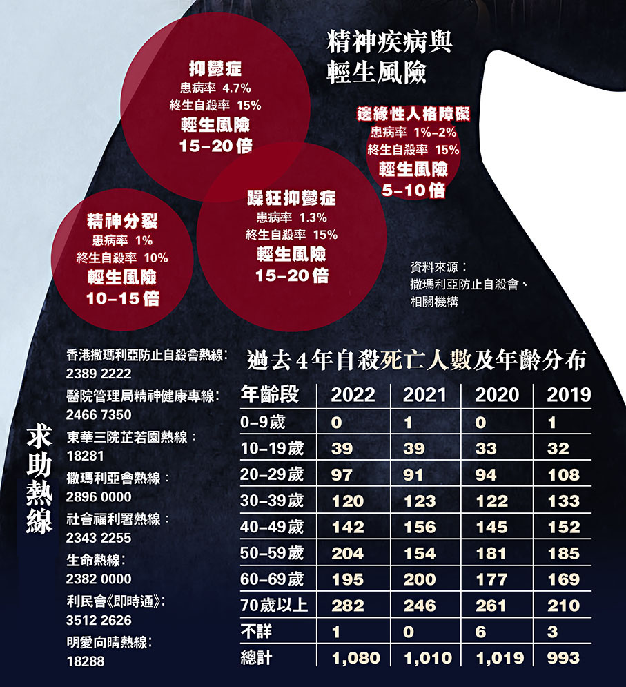 香港撒瑪利亞防止自殺會的分析又發現,在自殺死亡個案中,男女比例為1.7:1,即男性自殺死亡個案共676宗,女性自殺死亡個案共404宗,在去年熱線求助者的性別分布亦顯示,女性求助的問題多數是精神健康、家庭及人際相處等,而男性求助的問題則多數與工作、經濟有關。