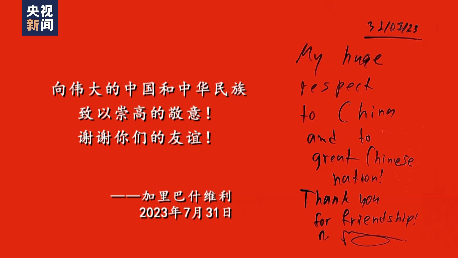 格魯吉亞總理加里巴什維利在接受總台專訪後題詞:向偉大的中國和中華民族致以崇高的敬意!謝謝你們的友誼!