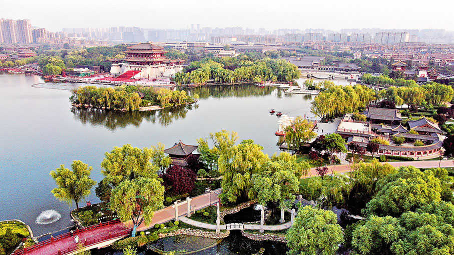 當中,大唐芙蓉園便位於西安市雁塔區曲江新區,在大雁塔東的唐朝曲江池遺址以北,是一座仿照唐朝的皇家禁苑建造的主題公園,佔地面積1,000畝,其中水域面積300畝,是中國第一個全方位展示盛唐風貌的大型皇家園林式文化主題公園,園內建有紫雲樓、仕女館、御宴宮、杏園、芳林苑、鳳鳴九天劇院、唐市等許多仿古建築。2011年,大唐芙蓉園被評為國家5A級旅遊景區﹔2018年,大唐芙蓉園入圍「神奇西北100景」榜單。