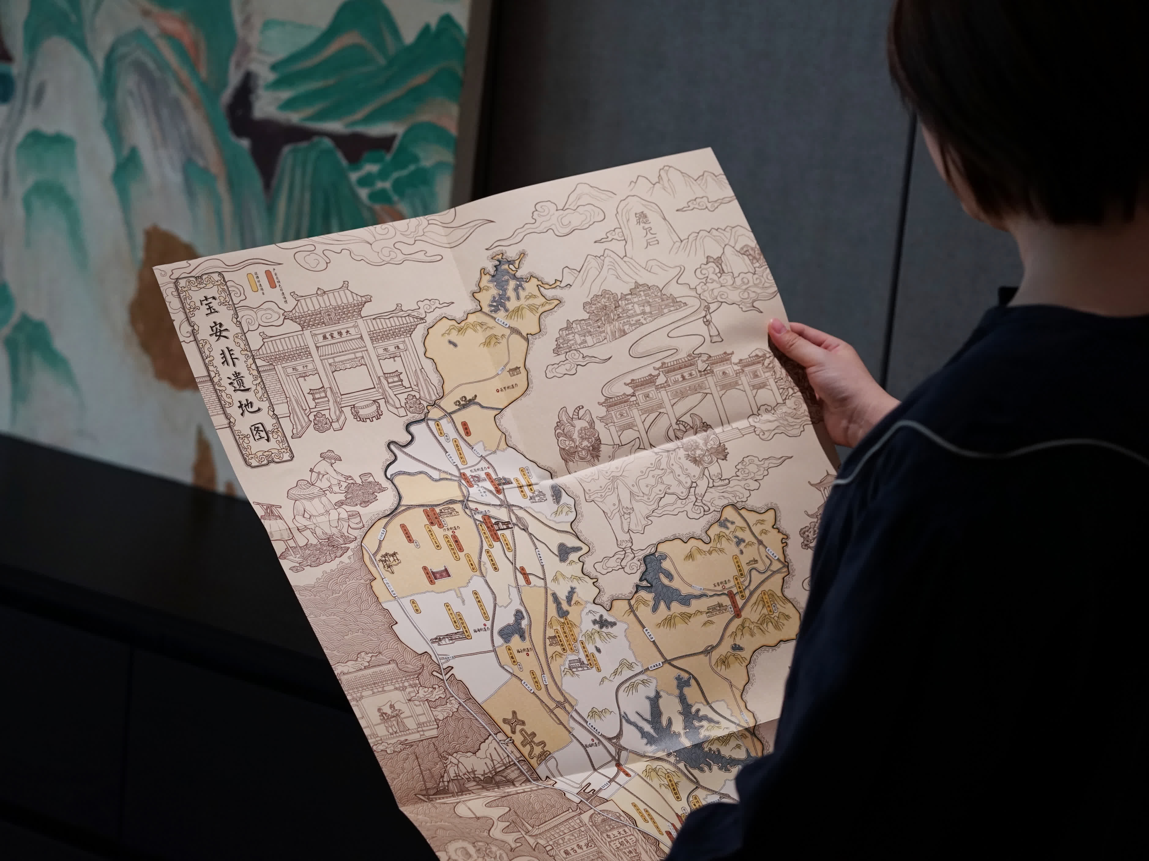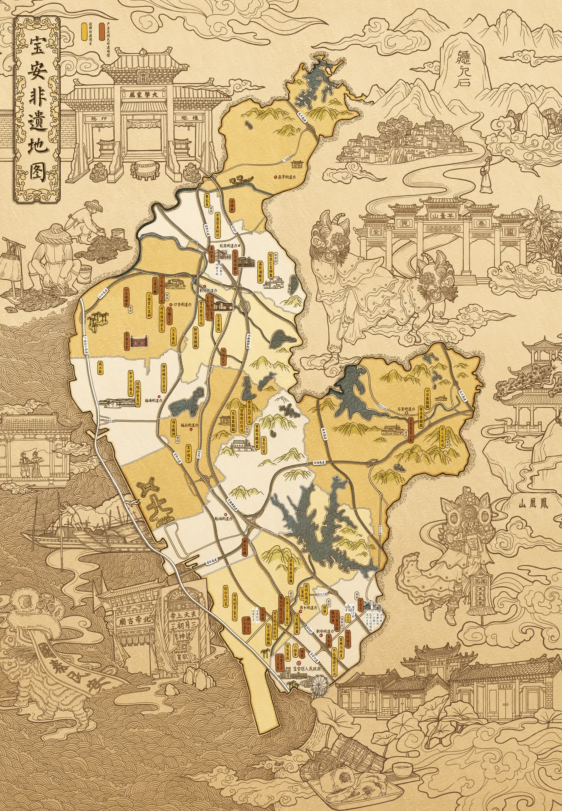 據了解,地圖由設計師歷時100餘日精心繪製,描繪了上川黃連勝醒獅舞(國家級)、沙井蚝生產習俗(省級)、西鄉北帝廟三月三廟會(省級)等11項寶安本土非遺代表性項目與地圖組合而成,繪畫生動有趣,令人耳目一新。
