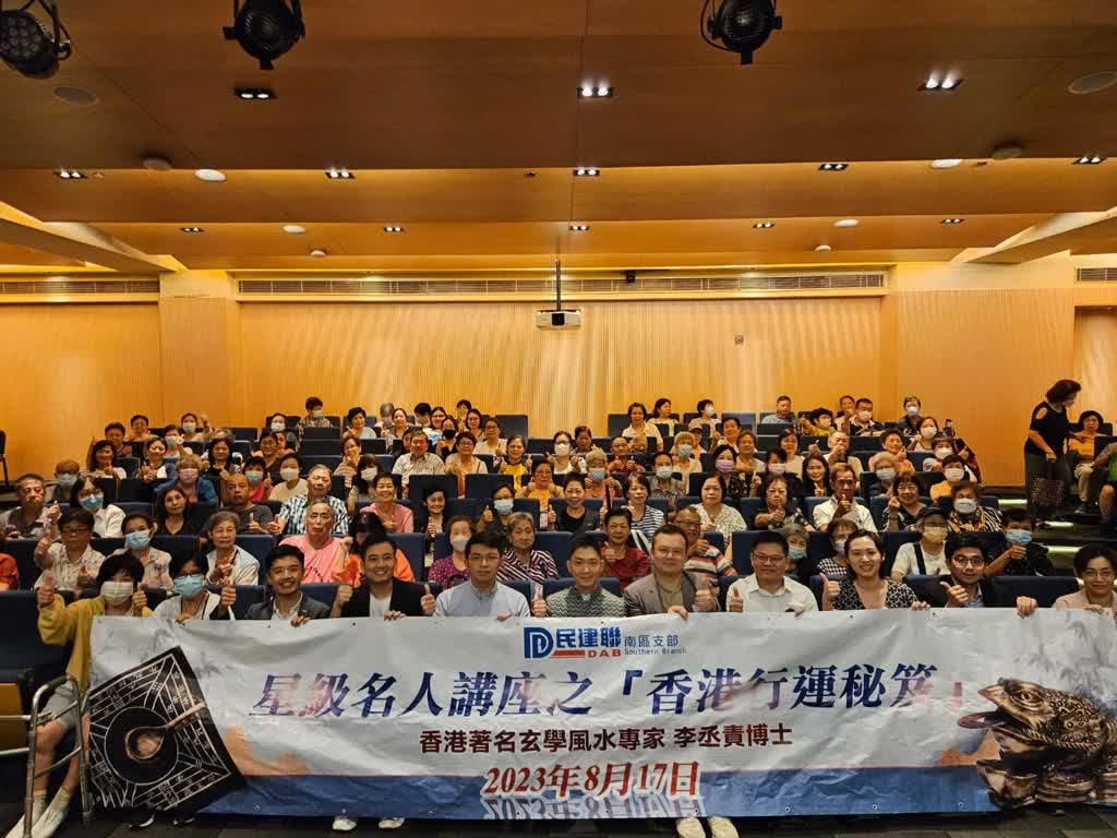 民建聯南區支部於今日舉辦了一場引人注目的活動,名為「香港行運秘笈」星級名人講座,由享譽香港的玄學風水專家李丞責博士主講。活動圓滿舉行,共有200位居民熱情參與。