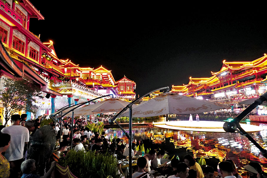 她並指,在策劃水街時,團隊曾在多個著名景點做調研,發現很多商業街都陷入了同質化競爭,而眉山作為一個常住人口僅約40萬的小城,若要脫穎而出,則必須提供其他地區沒有的新奇體驗。「現代人逛商場已經不是單純為了買東西,在家裏也能買,他們要尋求一種現場才有的獵奇經歷,所以我們將整個街區都打造為旅遊目的地,讓遊客有沉浸式體驗。」