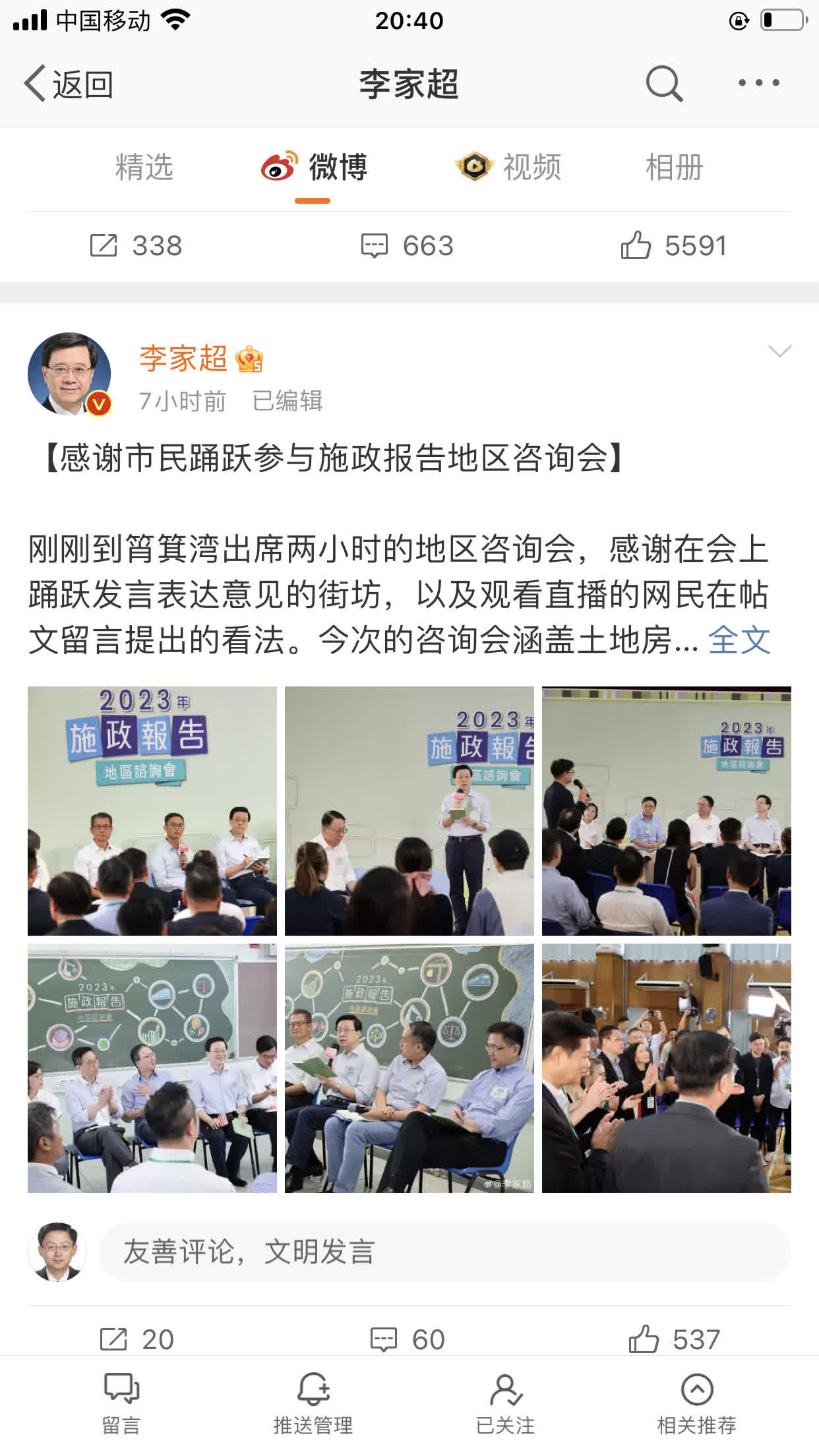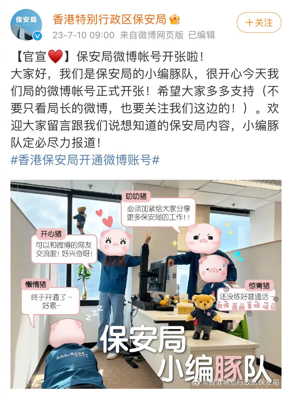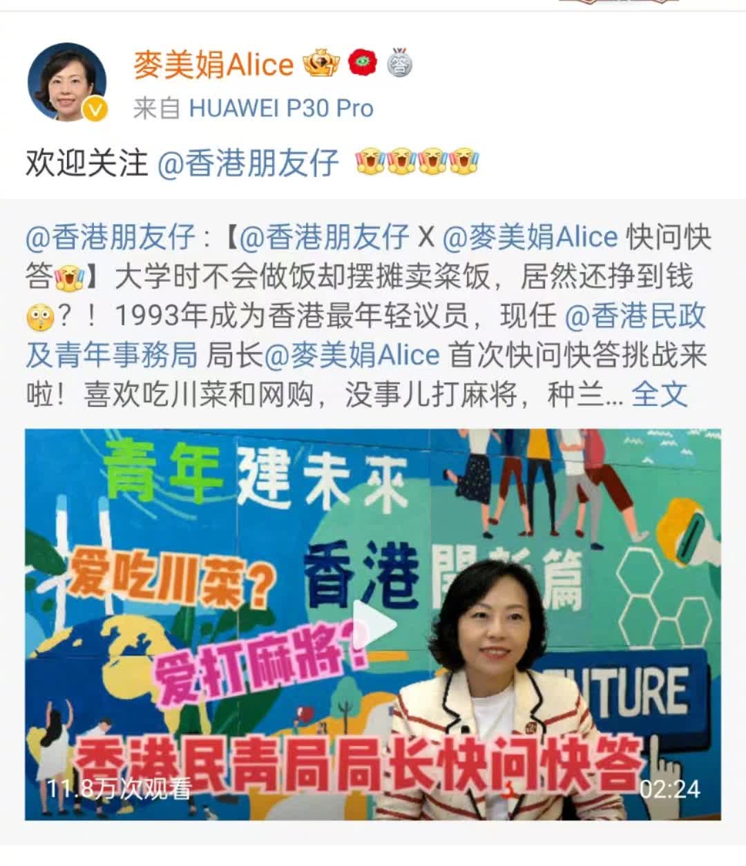 據「微博政務」官方統計,目前,已經認證的香港政務微博數量達到170餘個。包括香港特首@李家超,香港政府政務司司長@陳國基、香港財政司副司長@黃偉綸、香港民政及青年事務局局長@麥美娟Alice、香港保安局局長@鄧炳強 在內的多位政要官員,@香港民政及青年事務局 @香港旅遊發展局 @香港警察 等政務官微,以及@光頭警長、@高振邦Bon、@我是衝鋒小隊小陳 等多個香港警察微博。其中,麥美娟在擔任上一屆議員時就是微博大V,此番在新一屆政府中擔任局長後,民政與青年工作顯著提振,民政與青年的政務微博形成矩陣,包括這次微博政務推薦「香港朋友仔」,生動展現香港地區工作與兩地青年互動,這些微博通過特色內容、互動話題等吸引了不少內地粉絲們的關注,已然成為展示香港政府形象、和內地公眾交流的重要窗口。