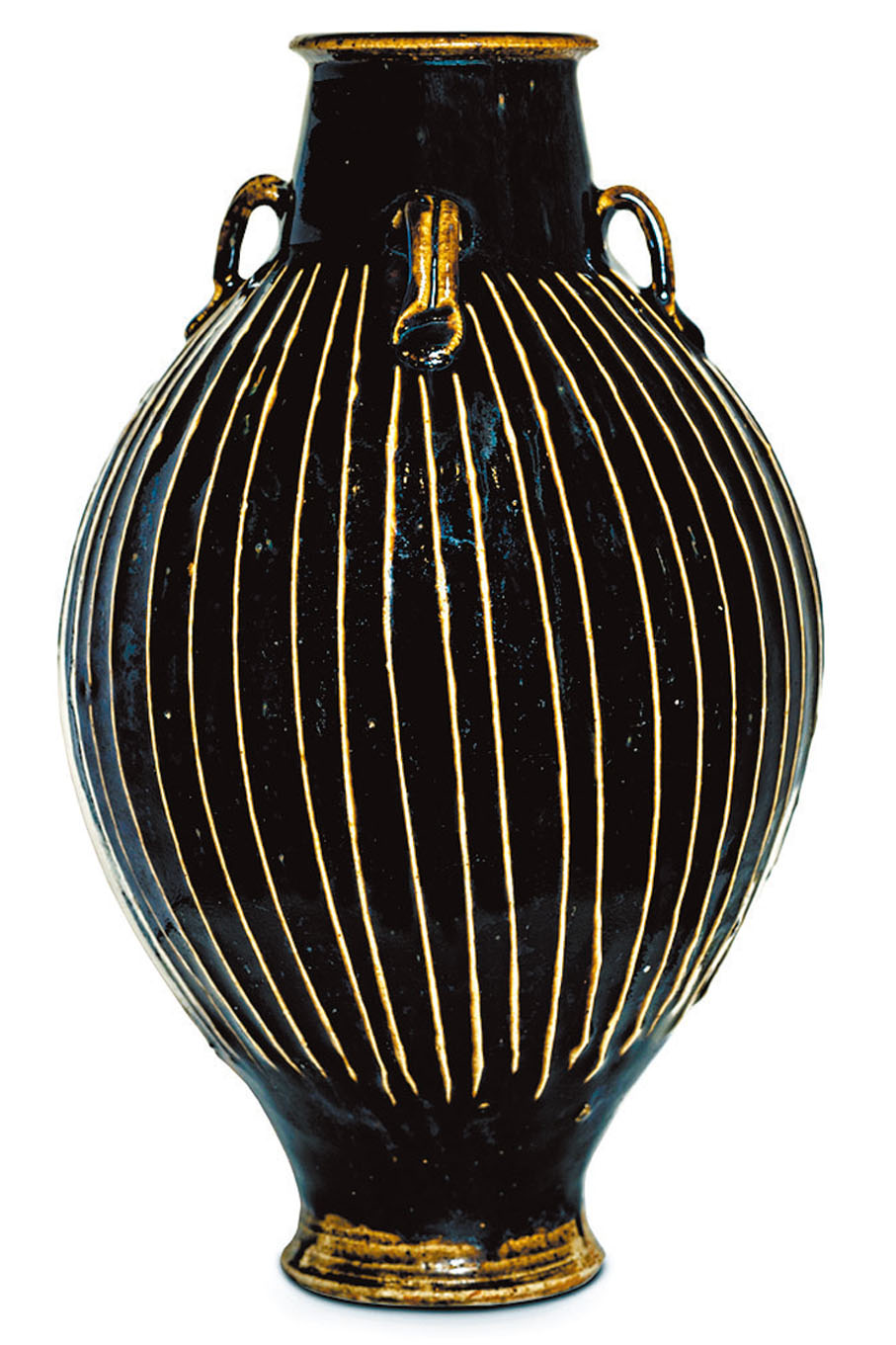 建窯作為「黑釉之魁」,是從漢代的黑釉瓷基礎上發展而來的。其實除了建窯之外,吉州窯、建陽窯、磁州窯系都是著名的黑釉瓷器主要窯廠,甚至連宋代五大名窯之一的定窯,亦兼燒黑瓷,俗稱「黑定」。在裝飾手法方面,部分瓷器會以褐色釉料施點狀斑塊於器身,燒製後形成「鐵鏽斑」的效果,這種藝術風格在海外亦廣受喜愛,可參見「北宋金黑釉鐵鏽斑盌」;亦有匠人以在黑釉下瀝粉成豎直線紋為裝飾手法,例如「宋山東淄博窰黑釉線紋四系耳尊」,這種器物在民間被稱為「線條瓶」、「線條罐」。◆作者:香港中華文化藝術推廣基金主席 李秀恒