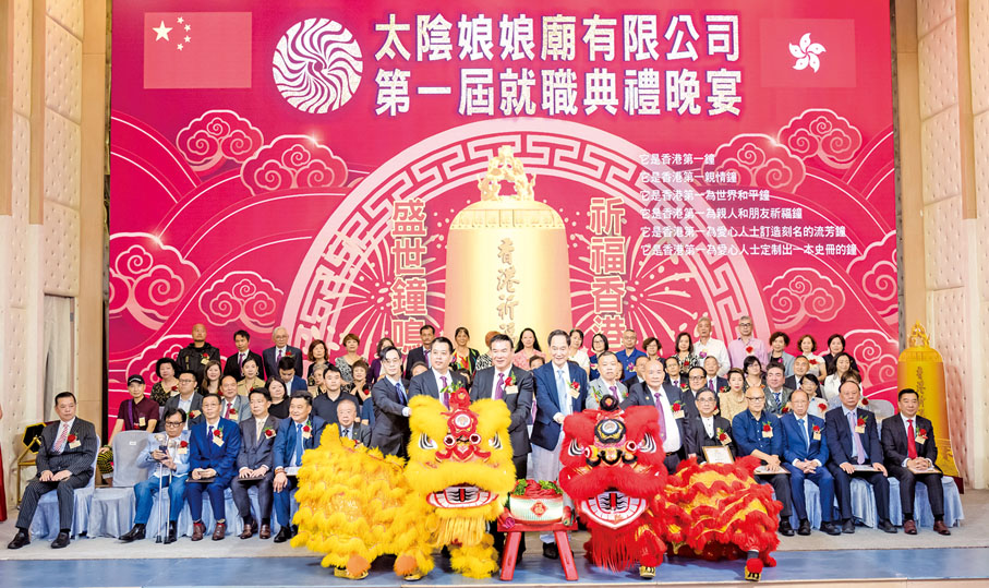 太陰娘娘廟有限公司第一屆就職典禮日前(8月23日)於九龍灣百樂金宴國際宴會廳隆重舉行,劉錦燦任首屆董事局主席,慈善活動宴開68席,現場鼓樂喧天、高朋滿座、人山人海!大會並舉行新聞發布會,向公眾介紹鑄造「香港祈褔鐘」為香港祈褔以及將舉行2024跨年「盛世鐘鳴·祈福香港」祈福系列活動,通過敲鐘祈福迎接充滿希望的2024年,為香港祈願消災免難、迎新納福、吉祥如意!