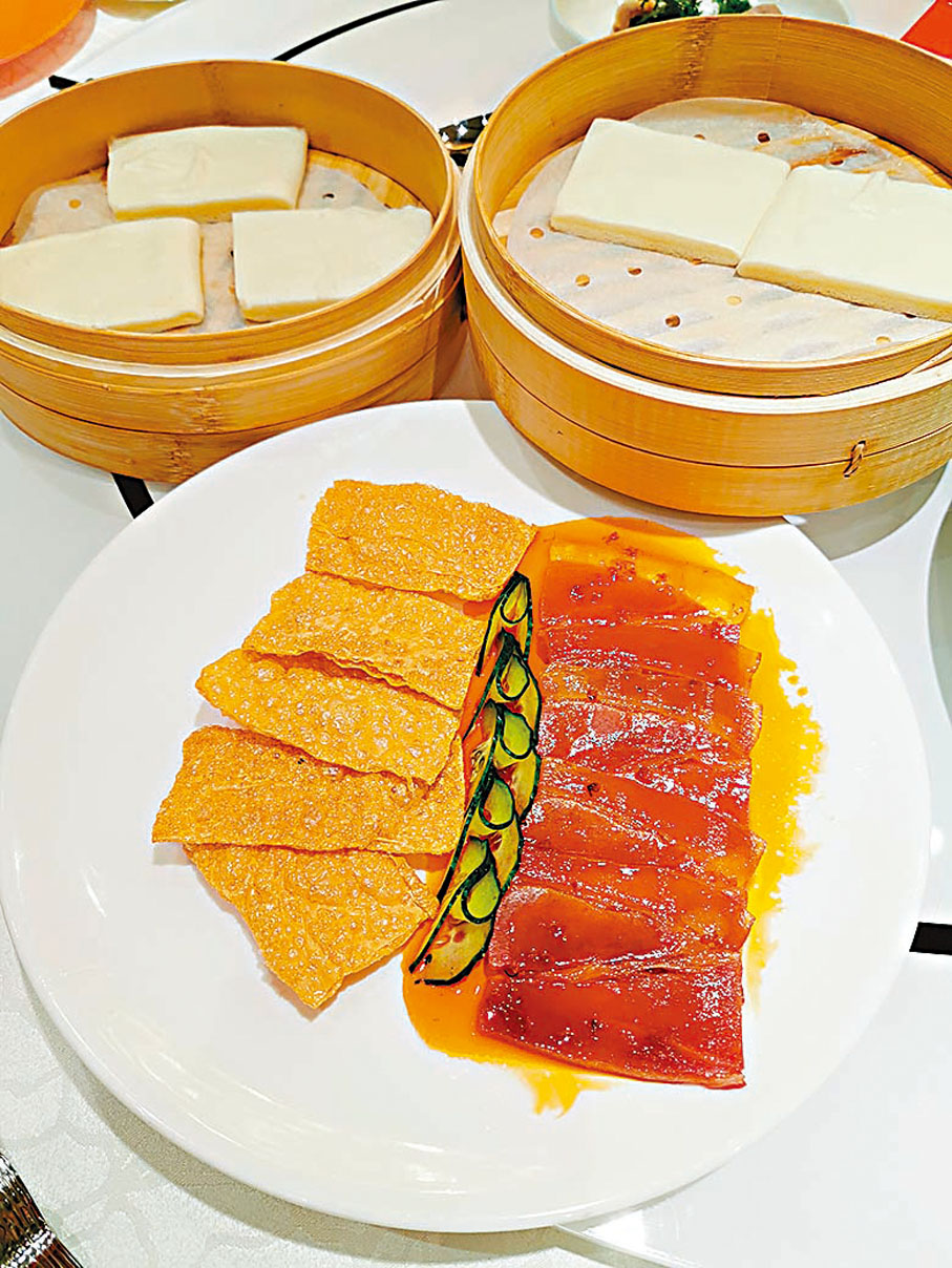 看他們的菜式示範,冷盤是開胃五小品,內有黑魚子燻蛋、南京鹽水鴨、皮蛋拌豆腐,四川口水雞及鎮江肴肉,其中鎮江肴肉,捨棄坊間的淨豬皮凍膠質,改用鹹豬手凍膠質、再加陳醋炮製,口感味覺都特別好!京菜的佼佼者「蜜汁火腿雙方」,黎師傅採用傳統上好火腿之餘,蜜汁加了秘製冰糖及桂花,特別在腐皮添加了蝦膠;吃起來有陣陣桂花香,腐皮特別脆口。