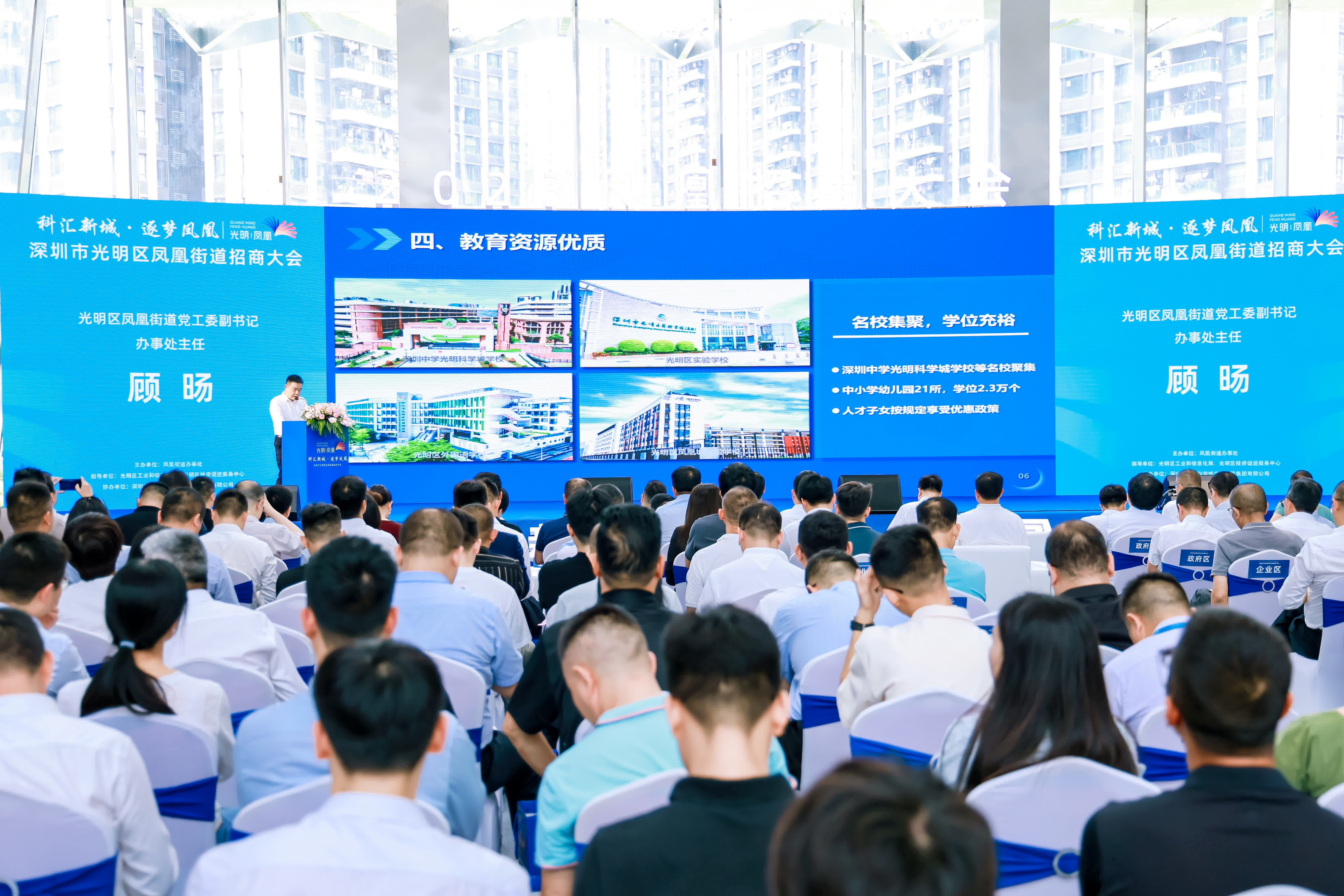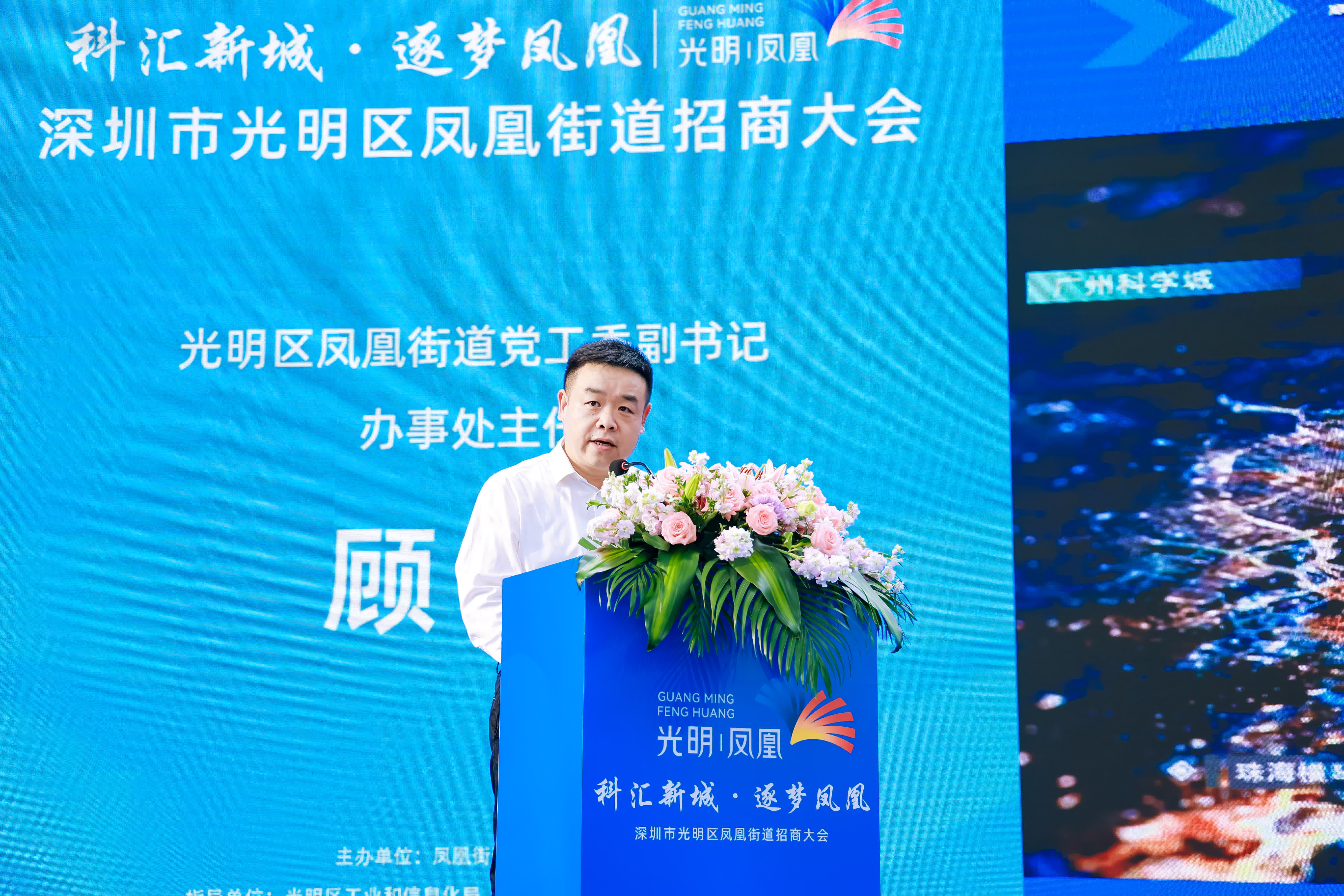 光明區鳳凰街道黨工委副書記、辦事處主任顧暘全方位介紹鳳凰街道的優勢與配套服務。