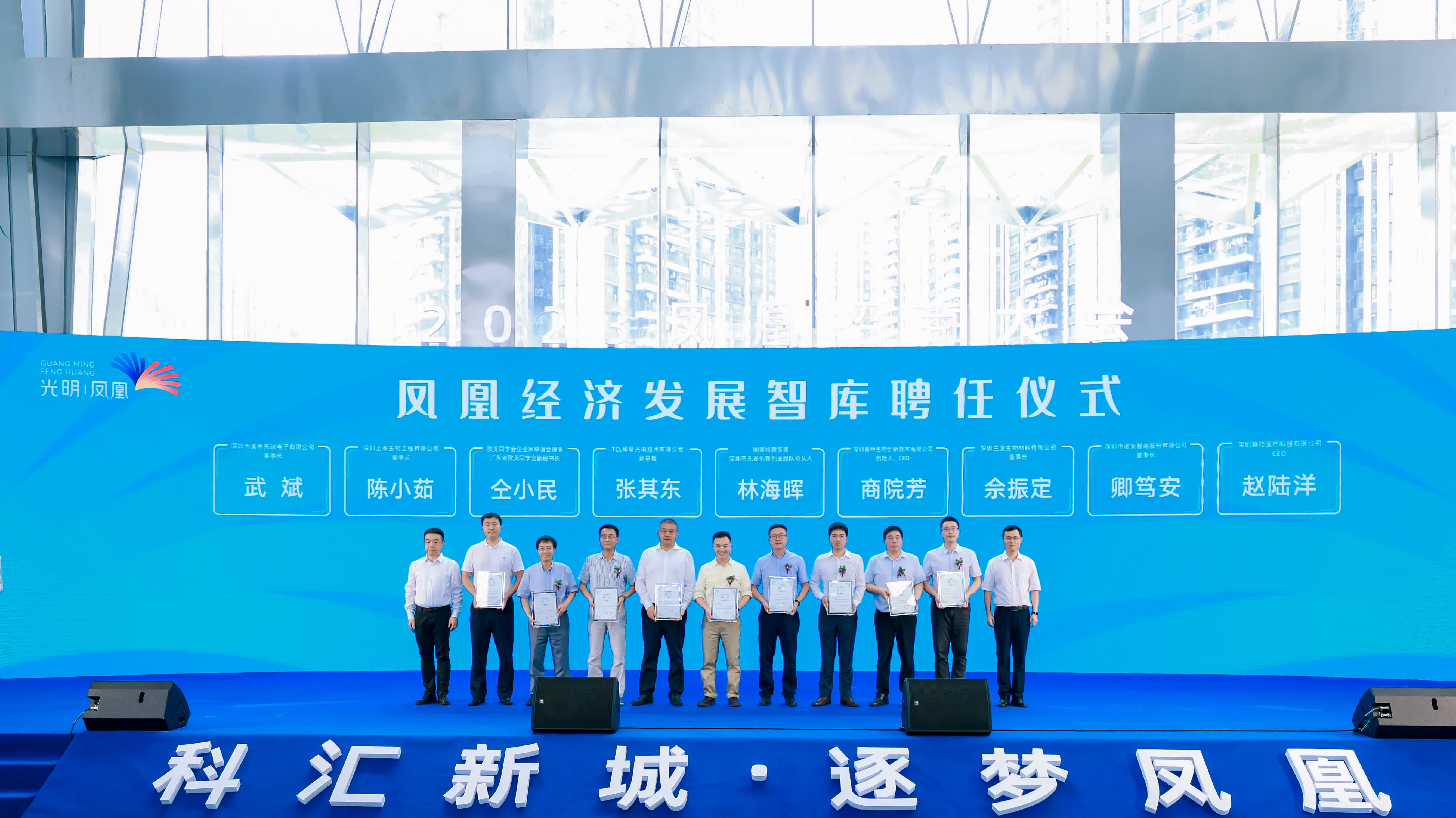 活動現場還舉行了鳳凰經濟發展智庫聘任儀式,TCL華星光電技術有限公司副總裁張其東、深圳上泰生物工程有限公司董事長陳小茹等9位專家獲頒聘書。
