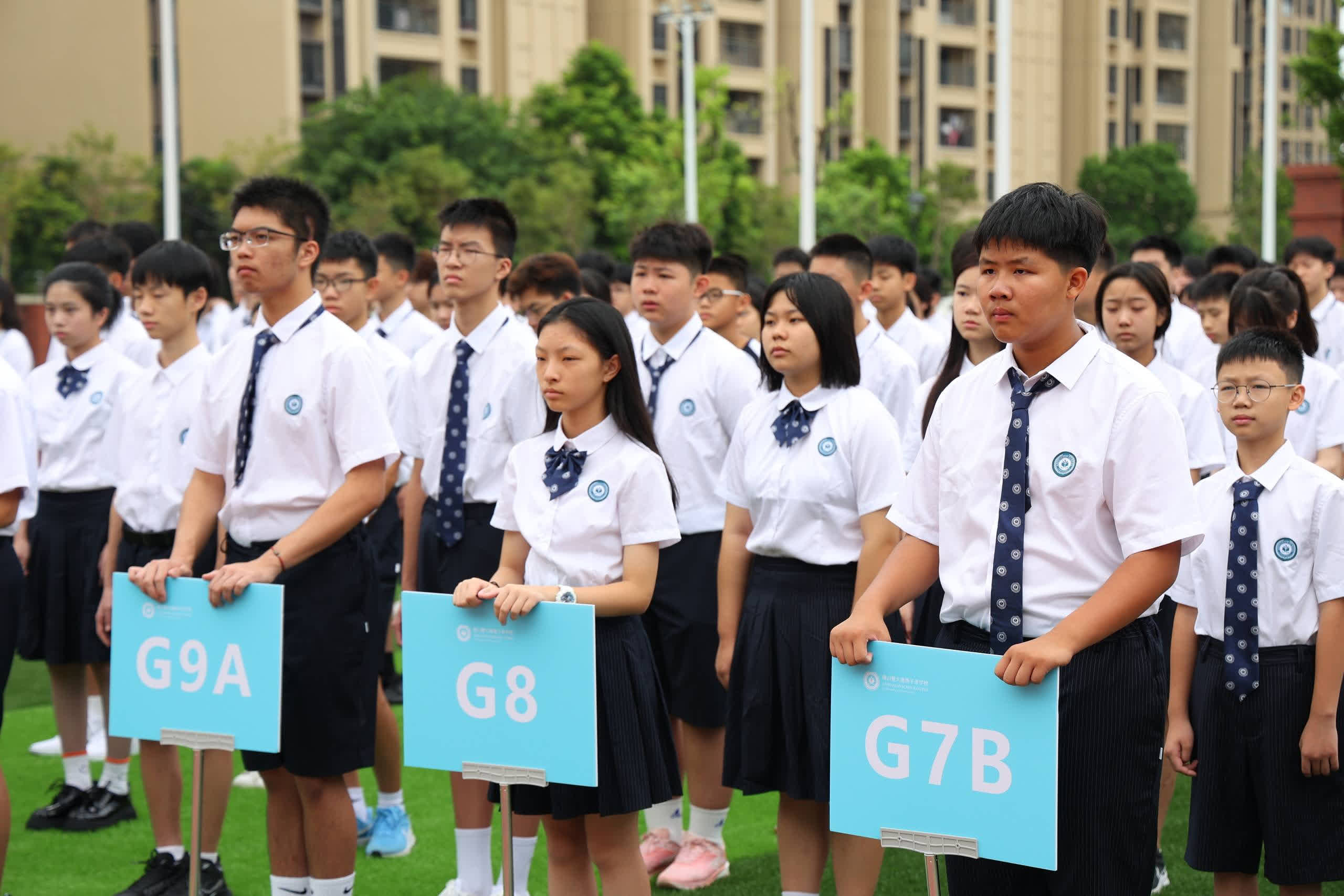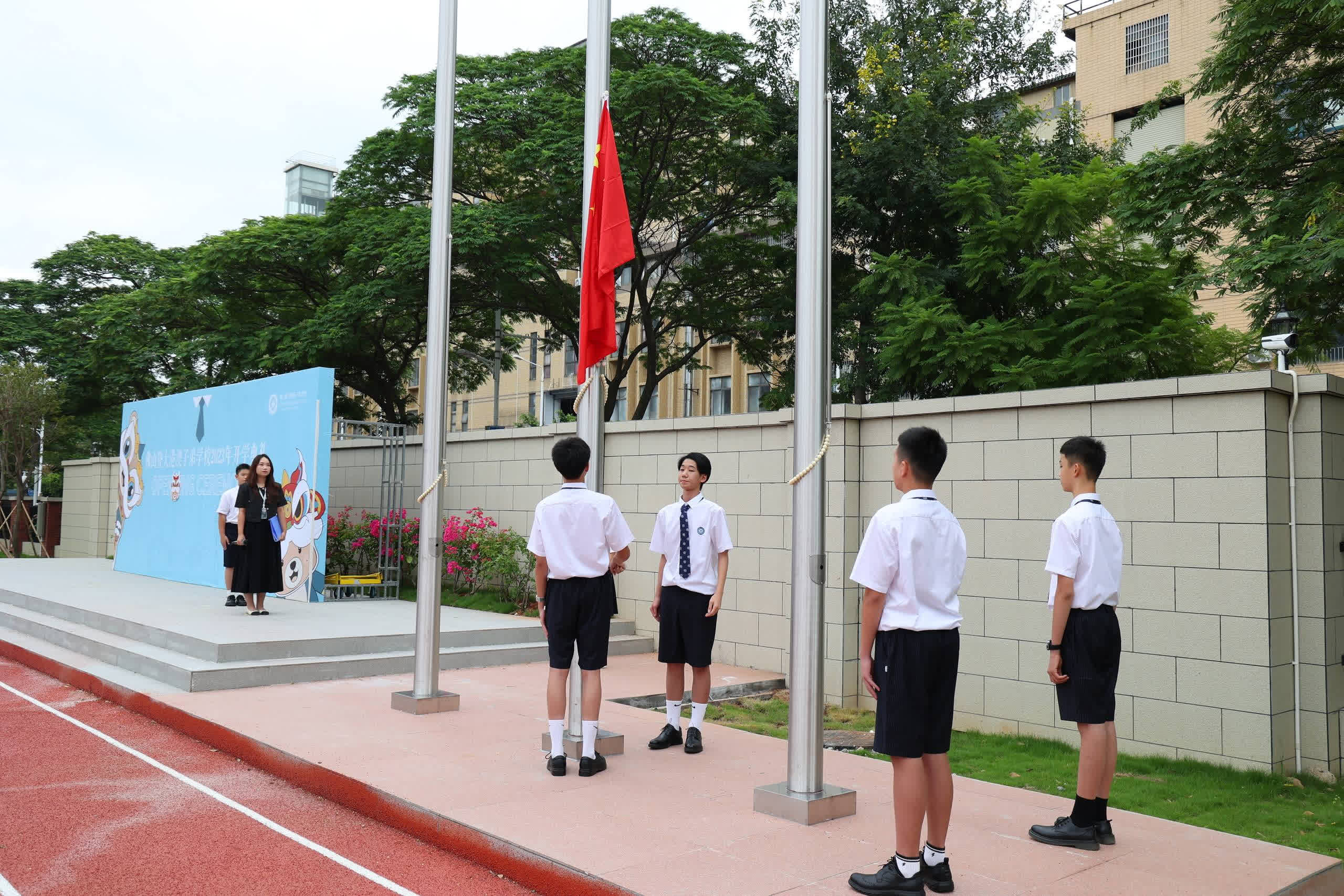 1日上午,學校在操場舉行升旗禮。雄壯的國歌聲中,五星紅旗在全體師生的註目中冉冉升起。佛山暨大港澳子弟學校總校長張曄表示,學校的使命是秉持「暨大本色、灣區底色、港澳特色」為發展定位,將港澳台僑學生培養成自覺擁護祖國統一、擁護「一國兩制」、為港澳長期繁榮穩定和實現祖國和平統一做貢獻的堅定愛國者。她表示,希望每一個同學,不僅是一個對自己負責任的人,同時還是為我們這個人類命運共同體負責任的人。