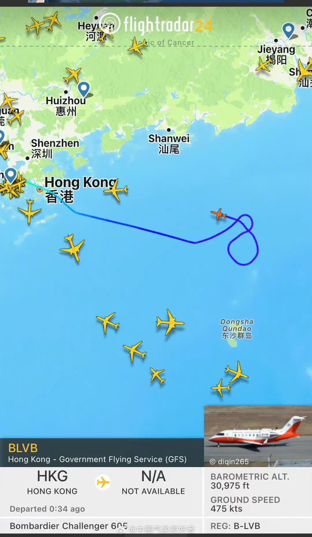 八號西北烈風或暴風信號現正生效,預計超強颱風「蘇拉」會在今晚(9月1日)至明早相當接近本港,在香港以南100公里內掠過。今日,微博「中國氣象愛好者」發布一則消息,提到香港天文台派出的飛機正在對「蘇拉」核心區及風眼進行探測,這是我國首次對超強颱風進行穿眼探測。