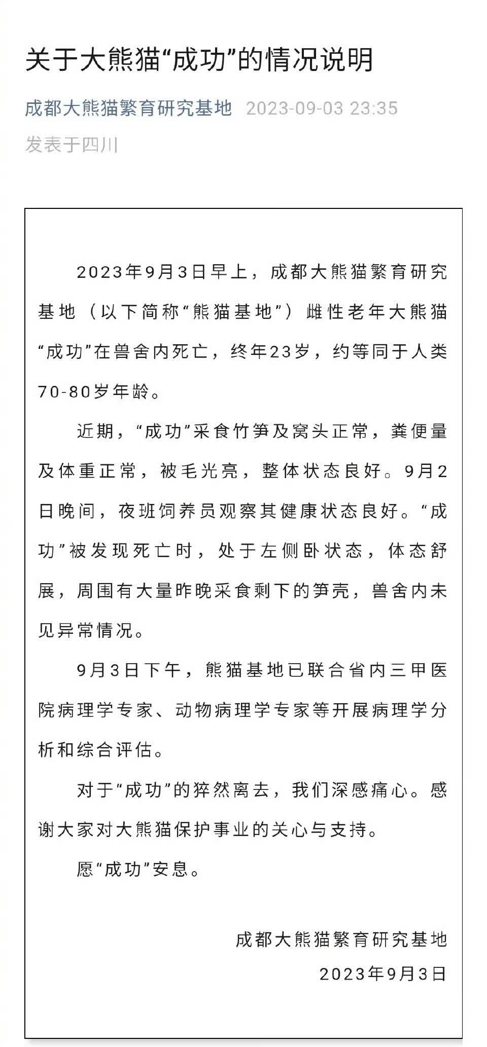 2023年9月3日早上,成都大熊貓繁育研究基地(以下簡稱「熊貓基地」)雌性老年大熊貓「成功」在獸舍內死亡,終年23歲,約等同於人類70-80歲年齡。