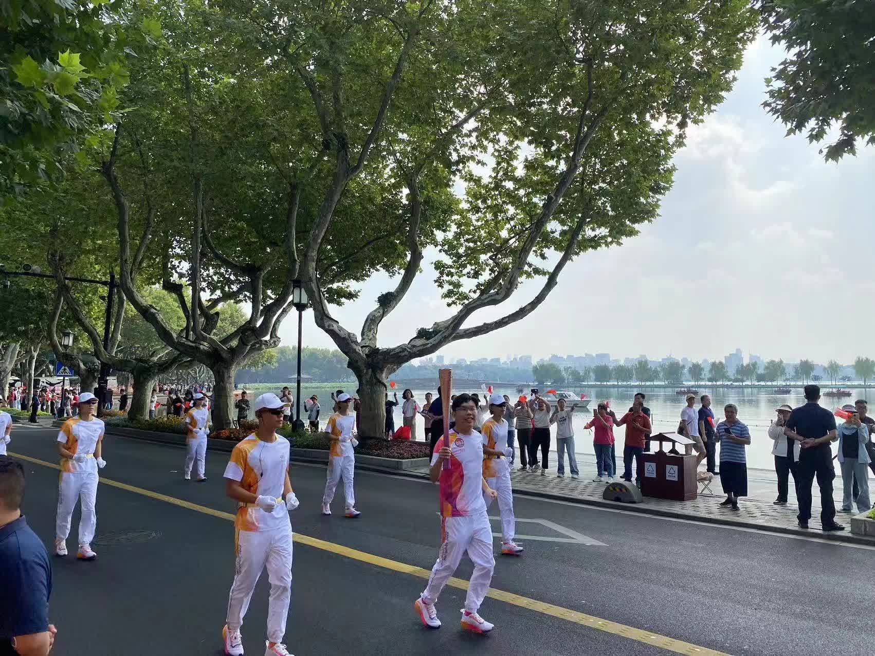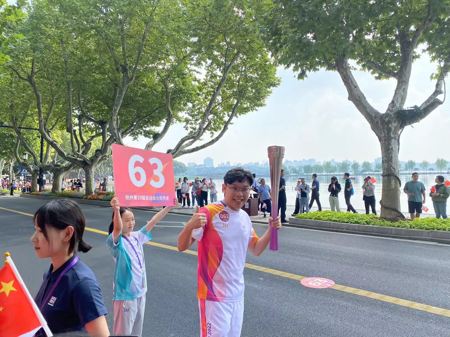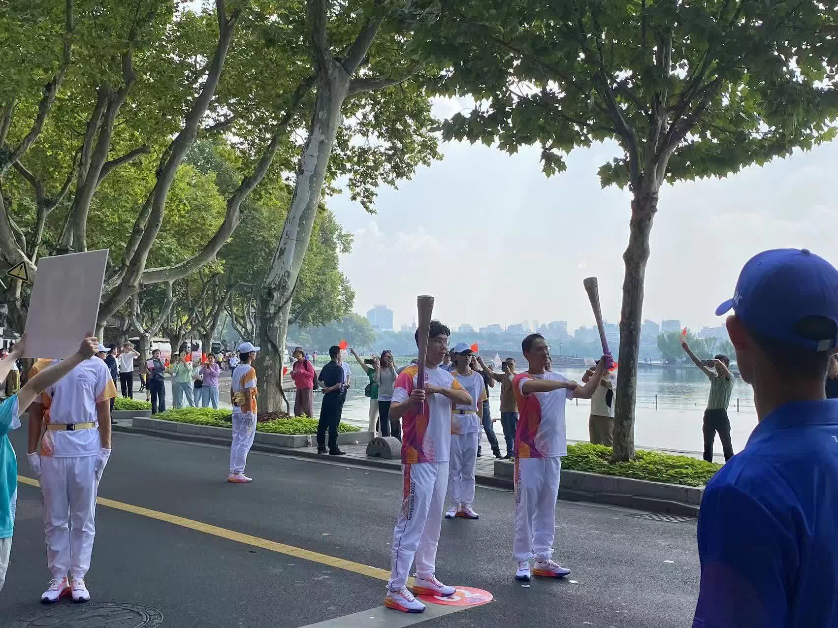 在傳遞過程中,讓沈慧林印象最深刻的是沿途早早等候的熱情觀眾,他們一邊揮舞着五星紅旗,一邊高呼「中國加油」「杭州加油」。「在我跑的過程中,有被沿途觀眾歡呼吶喊的熱情而感動到。今天杭州天氣還是有點熱的,但還有那麼多鄉親來現場支持火炬傳遞的活動。」他說,「我看到馬路兩邊的觀眾不停地向我揮手互動,我也向大家揮手表示感謝,這讓我感受到大家對於杭州亞運會的支持和期待。」