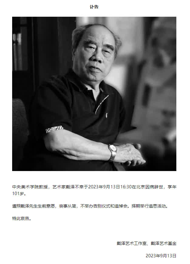 (香港文匯網記者 張蕊)戴澤藝術工作室、戴澤藝術基金發布訃告稱,中央美術學院教授、藝術家戴澤於9月13日16時30分在北京因病辭世,享年101歲。遵照戴澤先生生前意願,喪事從簡,不舉辦告別儀式和追悼會,擇期舉行追思活動。