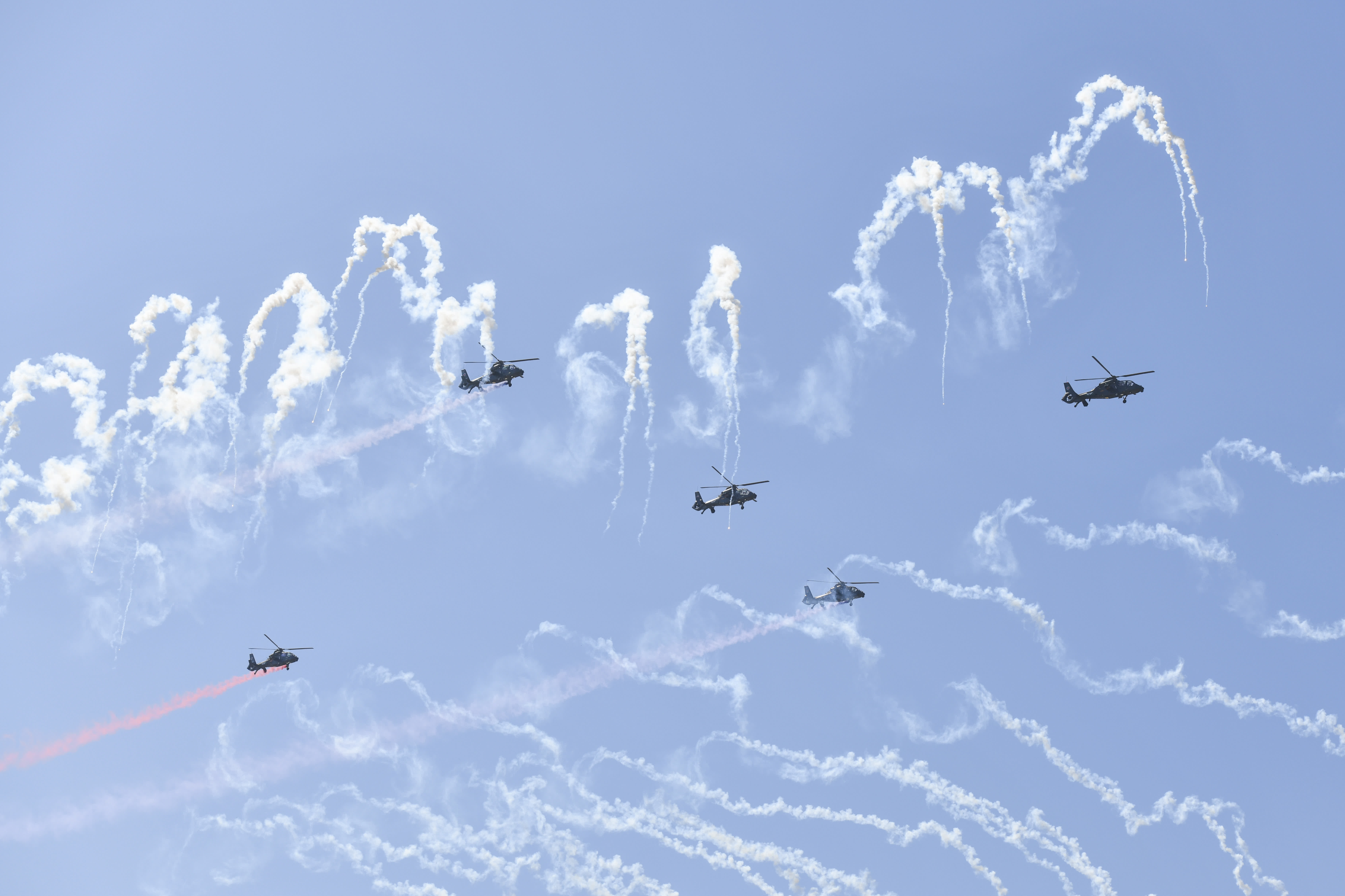 天津直博會是世界上唯一具有飛行表演的直升機專業展會,因此,直升機飛行表演一直是直博會的一大亮點,尤其是陸軍航空兵「風雷」飛行表演隊更是備受矚目。開幕式上,陸軍「風雷」表演隊7架直10武裝直升機、6架直19武裝直升機、2架直20戰術通用直升機依次帶來震撼的編隊、單機表演,先後向觀眾演示了三機芭蕾、空中隊列、尾追螺旋、四機開花等8個課目的特技飛行動作,精彩絕倫的表演讓現場觀眾掌聲不斷。