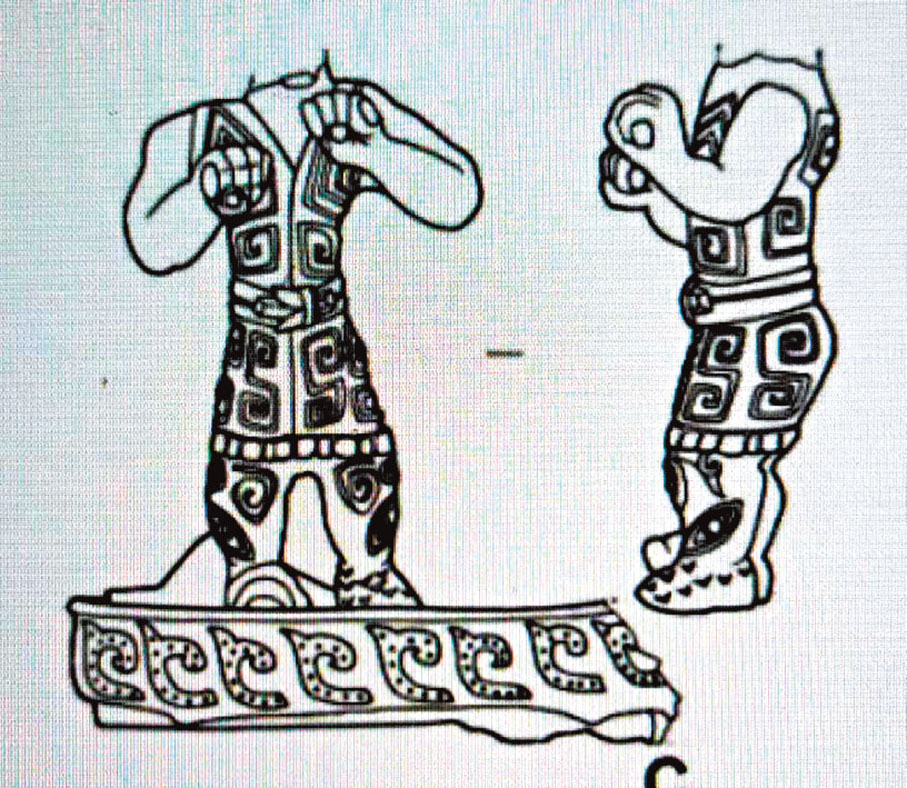 在中國遠古史中的大汶口文化期,陶器上有一種被稱為「日、火、山」的刻文(圖二),當代著名考古學家王仁湘先生解讀為「飛翔着的大眼睛」,指向民族遷徙中的「太陽與飛鳥」。這個民族遷徙應該就是「楊說」之一提到的炎帝後裔的向東遷徙,也可以說是「創造三星堆的人」的最早的一支始祖部落。無獨有偶,在現今發現的三星堆青銅器的刻文上也有眼紋(圖三)。只不過不是「飛翔着的大眼睛」,而是「行走着的大眼睛」,一樣指向民族遷徙。記錄着如此重大歷史事件的「眼形器」,在三星堆遺址中的大量出現是符合邏輯的。