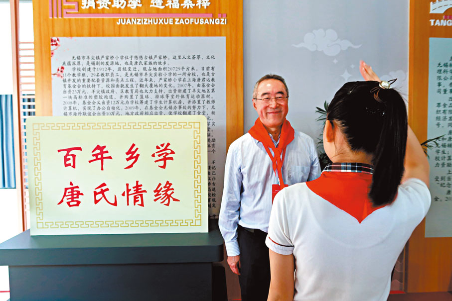 9月18日上午,唐英年陪伴母親與親友團來到無錫錫山區羊尖鎮嚴家橋小學,為小學運動場基石揭幕。2021年上海唐君遠教育基金會捐資百萬元(人民幣,下同)用於「嚴家橋小學體育運動場地和體育項目建設」。嚴家橋小學學生為唐英年佩戴紅領巾並行少先隊隊禮。唐英年笑容滿面,他說,「嚴家橋是我的故鄉,我們唐氏家族幾代人都在這裏生活與工作過。崇文重教是我們中國人美好的傳統,我希望對學生們能傳遞更多愛國精神與愛國情懷。」