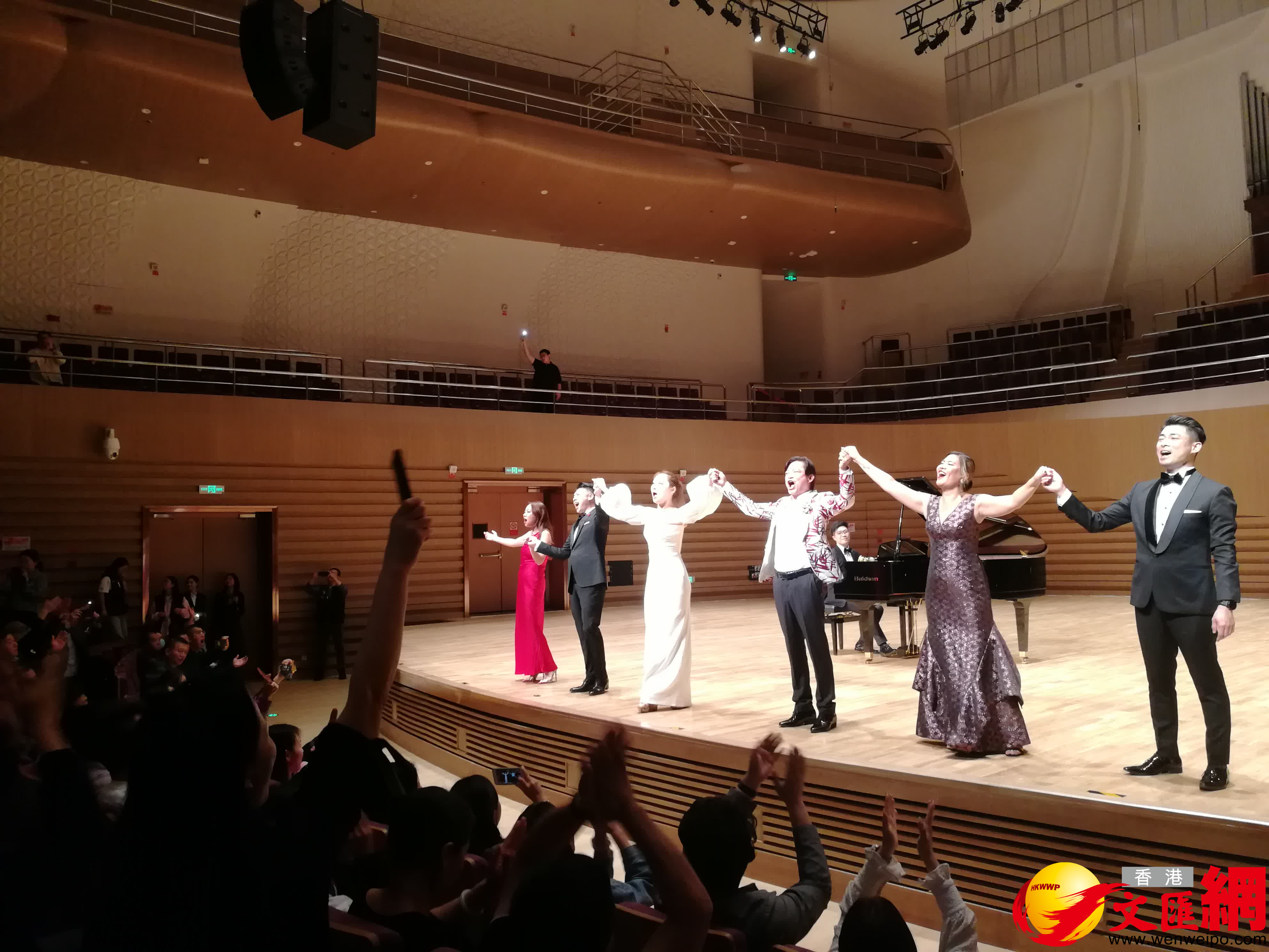 藝術家們還現場加演了《達阪城的姑娘》、歌劇《茶花女》選段「祝酒歌」,演出在大合唱《我和我的祖國》中達到高潮。