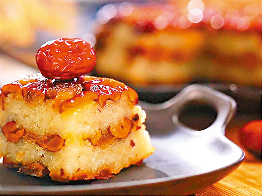 為了破解這個謎題,我翻查了不少古籍,後來在北宋人陶榖寫的《清異錄·饌羞門》找到了一個紀錄,大意是說當時在「皇建僧舍」旁邊有個糕坊,那店主賣糕賣到成為「員外官」,而他也因此被時人稱為「花糕員外」。他的糕坊中有種花糕是「糝拌夾棗豆」,即是用米加上棗子造成,估計就是《燒尾食單》的「龍鳳糕」。