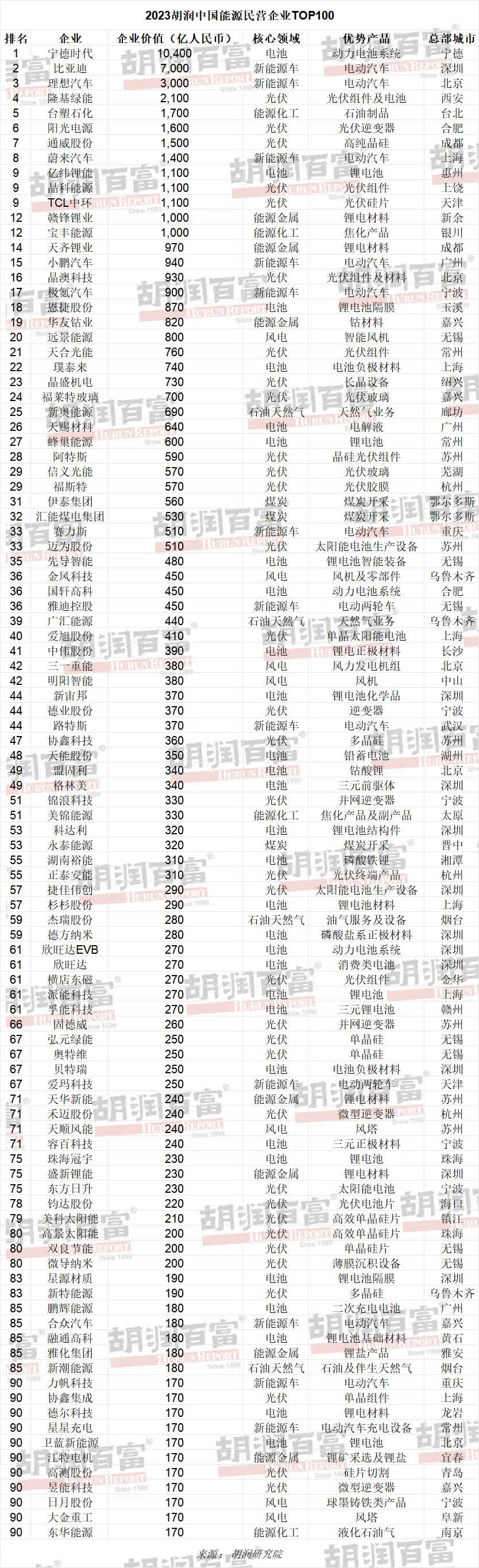 該榜單分傳統能源企業和新能源企業,傳統能源企業依然佔有一席之地,有11家,新能源企業的佔比更高,有89家。「中國要在2060年前實現碳中和,化石能源作為燃料的用量必定要減少,為新能源讓路。」胡潤百富董事長兼首席調研官胡潤說。