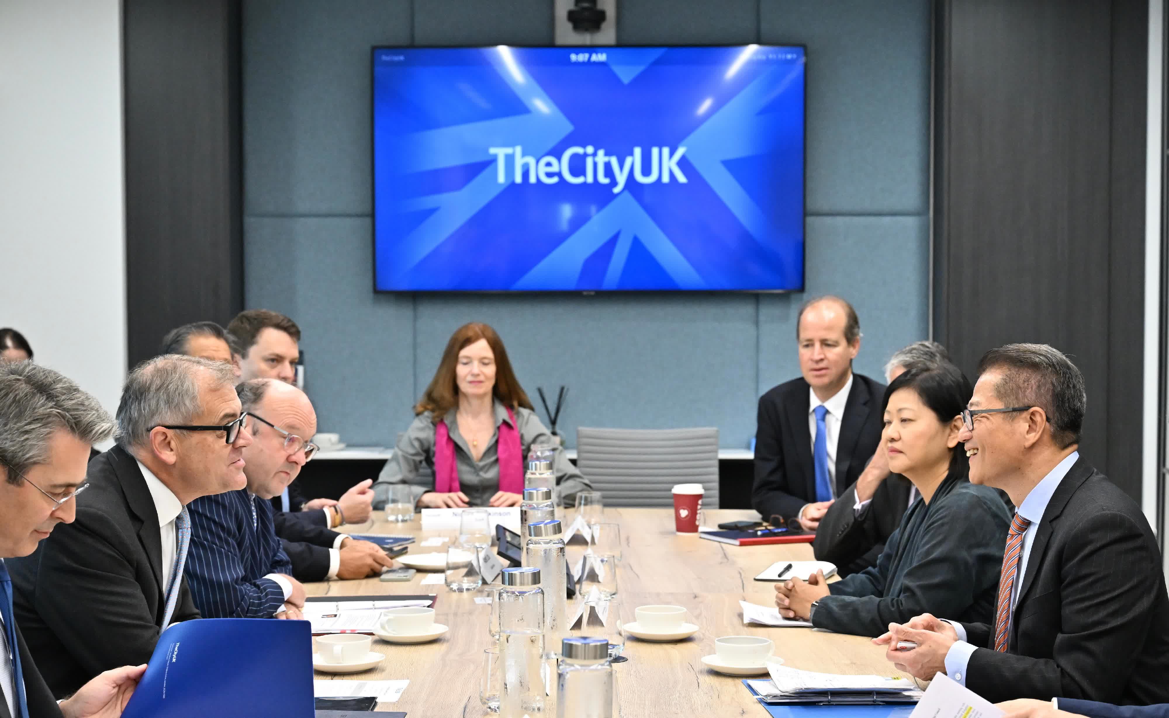 早上,陳茂波與由英國金融服務行業代表組成的商界組織The CityUK舉行圓桌會議。他向與會者介紹了香港最新的經濟和金融情況,以及金融服務業短中長期的發展機遇與重點,並指出香港是英國金融和資產管理機構開展內地和亞洲市場的理想門戶和平台,期待兩地加強多方面的合作。陳茂波亦和與會者就促進跨境投資、金融科技、綠色金融等方面交流看法。