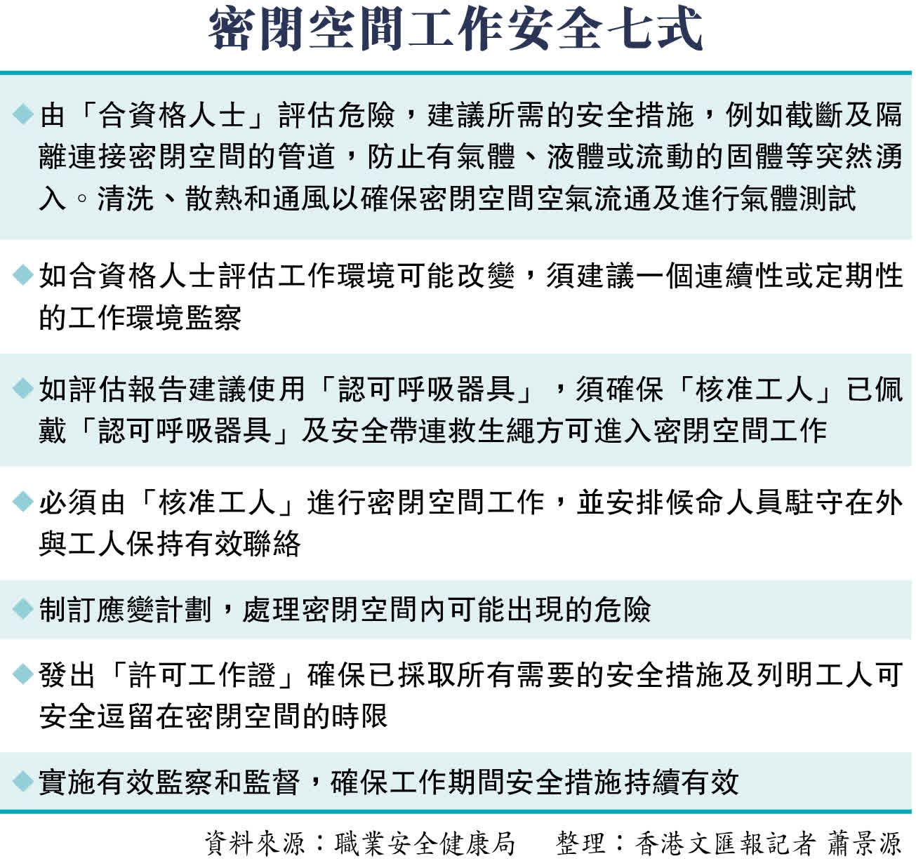 香港建造業總工會職業安全顧問李光昇坦言「事件好奇怪!」指法例規定進入管道工作的工人,一定要完成勞工處認可的「核准工人課程」,並需要合資格人士對現場環境做足5方面的安全評估,包括爆炸、中暑、危害氣體、水浸遇溺及流動固體的危險。工人進入前亦需要根據評估報告的建議佩戴個人防護用品,例如全套氧氣筒連同呼吸器及繫上安全帶,並保持與外人員溝通,一旦發生危險外面的人可隨時將工人由管道拉出。