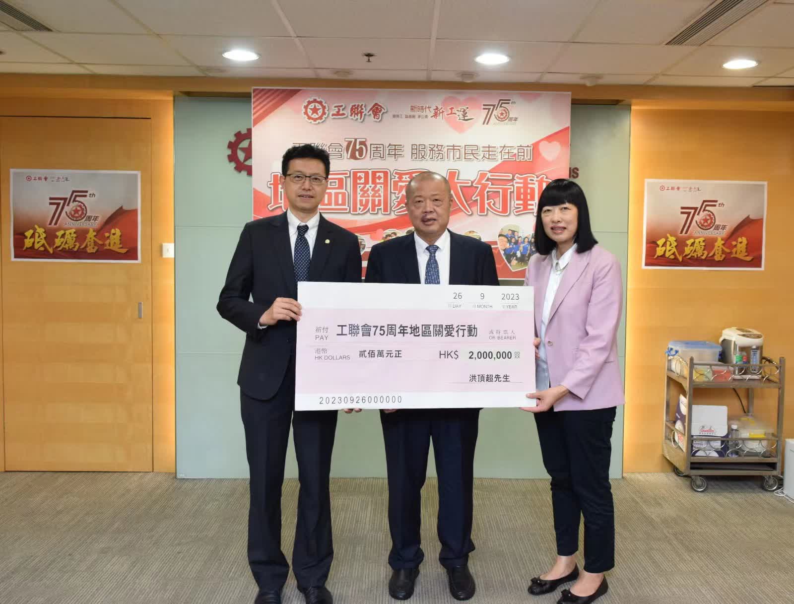 為基層市民送上關愛服務,為建設和諧幸福社區出一分力,洪頂超先生今日(26日)向工聯會75周年「地區關愛大行動」捐贈200萬港元,以期與工聯會攜手合作。工聯會舉辦簡單而隆重的支票捐贈儀式,由會長吳秋北、副會長謝愛紅代表接受捐款。