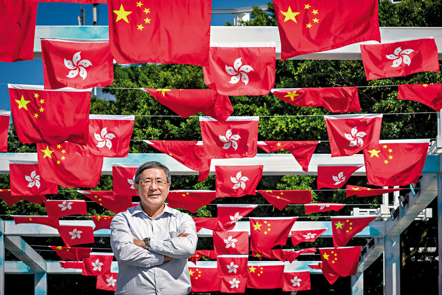 特區政府政務司副司長卓永興昨日在社交網站發帖表示,香港特區政府在超過3,000個地點展示了逾11萬件裝飾物品,國旗和區旗超過7萬。數量較今年7月1日大增,且展示範圍更廣,而掛在燈柱上的彩旗亦由並排兩幅細旗改為一幅過的大旗,令彩旗更加奪目耀眼。圖為卓永興在中山紀念公園的旗海下打卡。