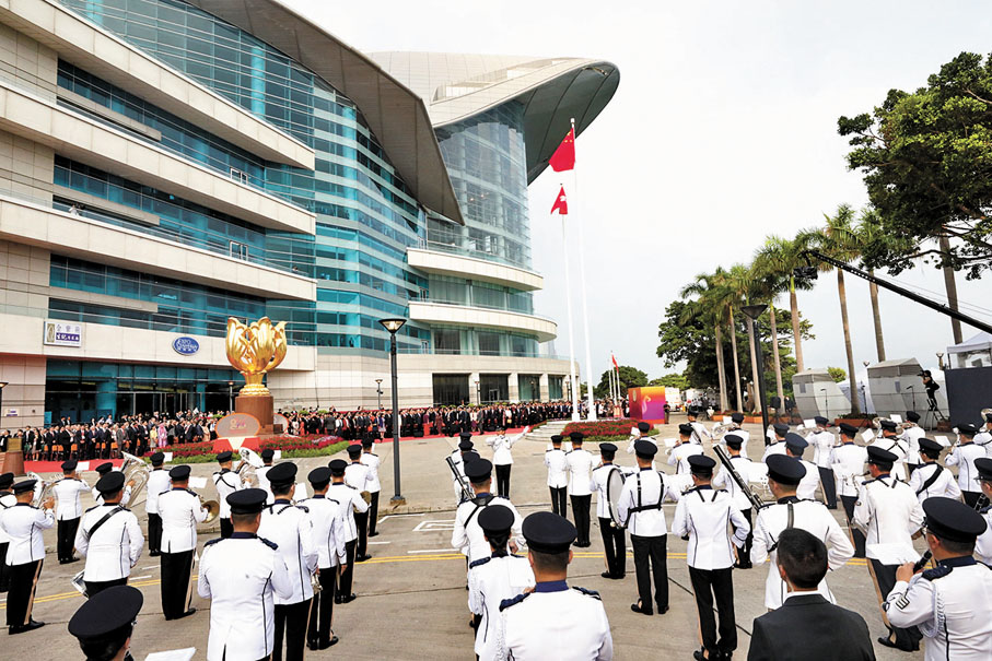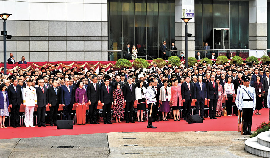 與此同時,特區政府飛行服務隊直升機懸掛着大幅國旗和區旗,飛過維多利亞港上空。香港紀律部隊消防船駛過維港水面,噴灑高高的水柱向偉大祖國致以崇高敬意。升旗儀式後,特區政府在毗鄰的會議展覽中心舉行國慶酒會。