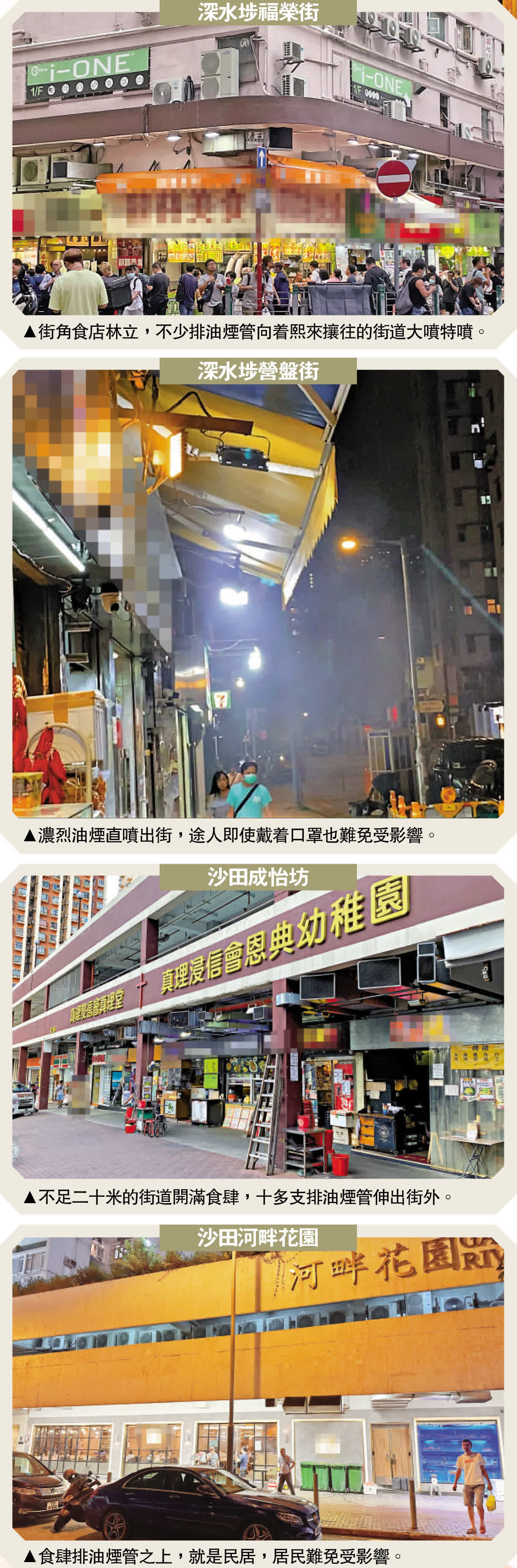 在荃灣三陂坊、沙田河畔花園崗背街及怡成坊,很多食肆樓上是民居,短短街道排油煙管都超過十條,這些抽油煙機的排氣口,全延伸出舖外對着大街,每到午飯或晚市時段,不停排出白煙,大街小巷充斥油煙味,空氣渾濁不堪,嚴重影響街坊和樓上的居民健康。