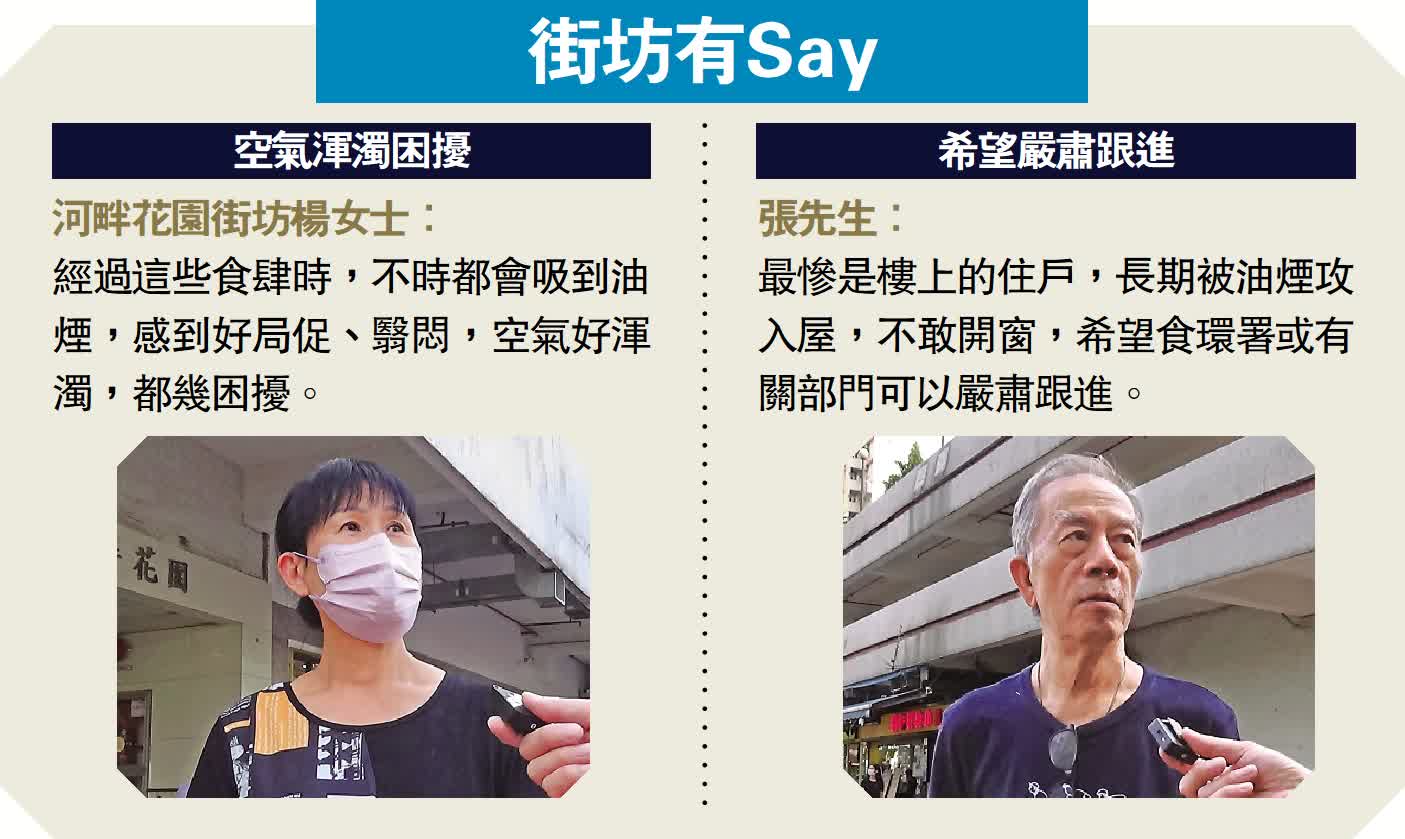 有不願上鏡的居民向記者表示,這些食肆,尤其是專做夜市的燒烤、火鍋店,排放油煙情況嚴重,晚上繁忙時段最「誇張」時,即使關好門窗,辛辣的油煙味仍攻入屋內。低層住戶更是「長年都唔敢開窗」,連衣服也被迫晾在屋內。居民希望政府加強對陳舊或不良排煙系統食肆的巡查和處罰,並要其整改達到排放標準方可營業。記者在食肆附近逗留十多分鐘,身上衣服已吸附了陣陣的油煙味,可見問題嚴重。