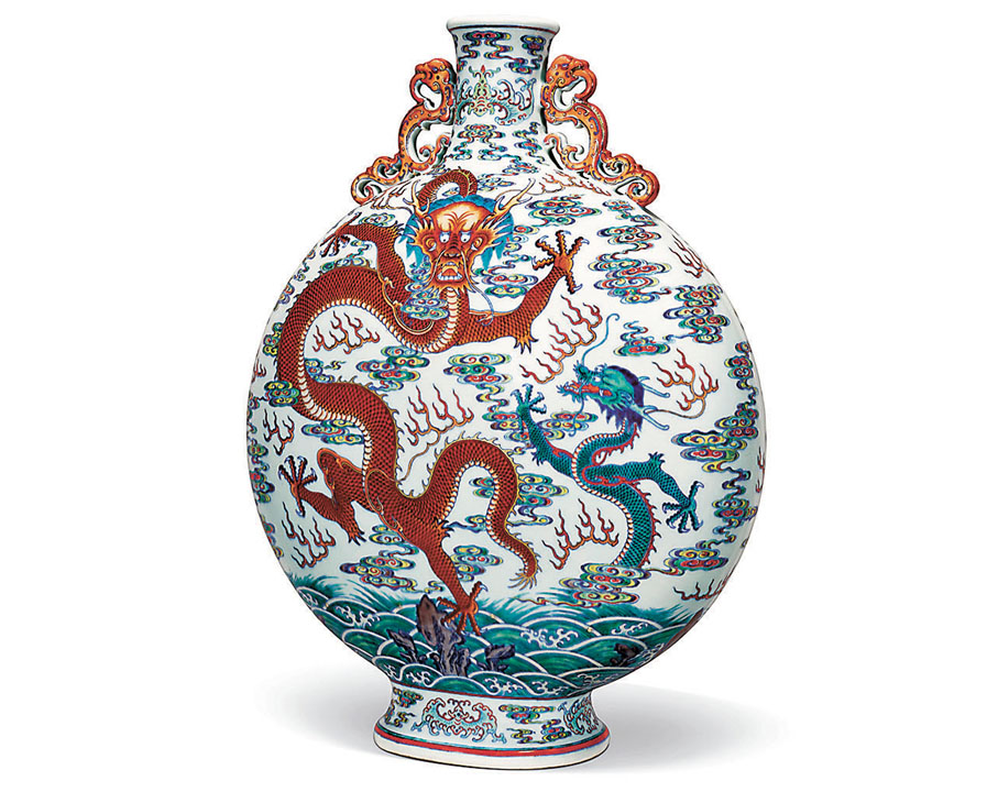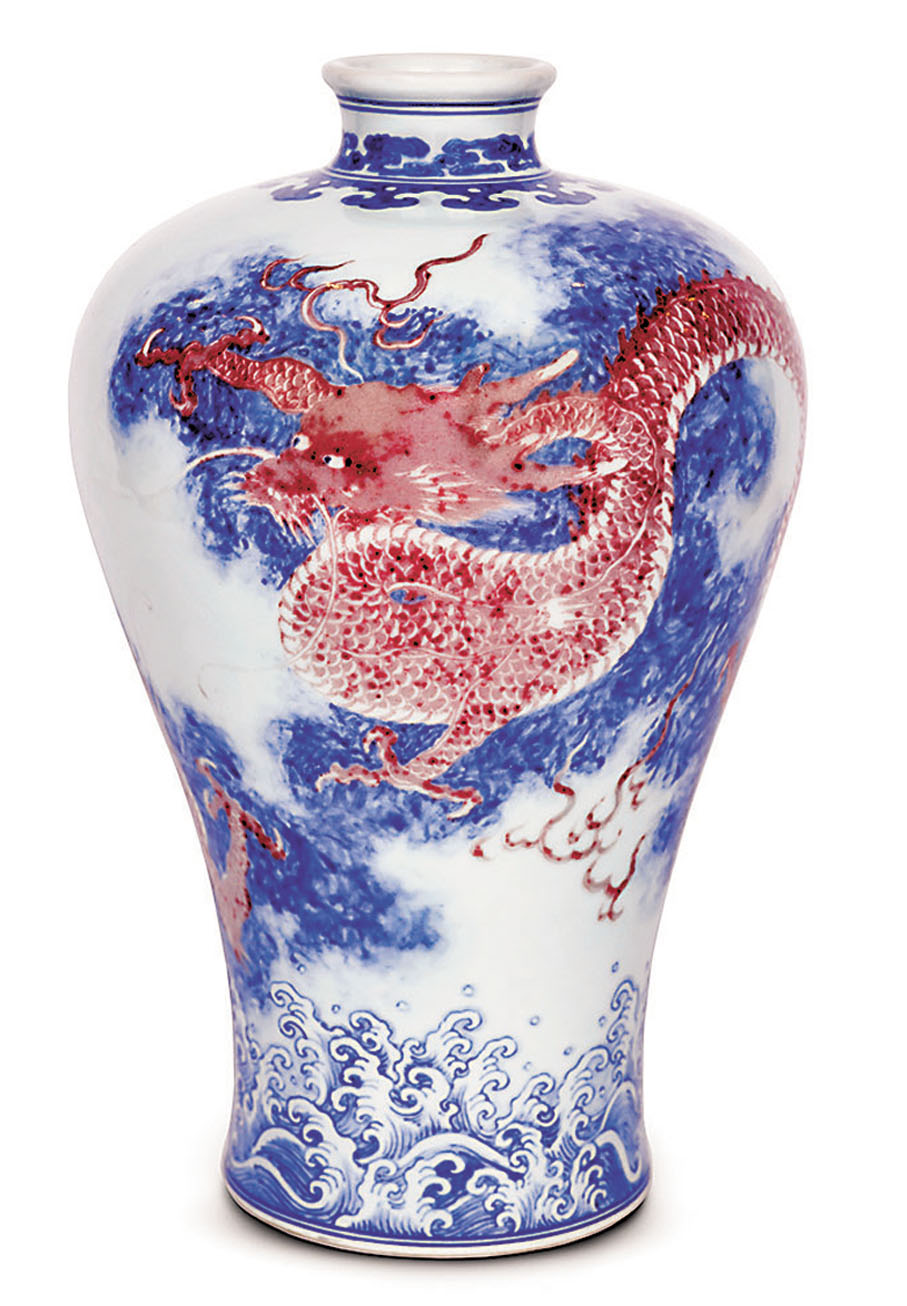 這種成對的龍紋在唐英擔任督陶官的時期發展成熟,以《香港收藏大展》上的一支「清雍正青花釉裏紅蒼龍教子圖梅瓶」及今年5月在香港佳士得以1.08億港元成交的一支「清乾隆鬥彩蒼龍教子圖夔龍耳抱月瓶」為例,穿騰於祥雲之中的大龍正招喚在海水波濤中昂首應聲的小龍,整體氣勢壯闊恢宏,大龍蒼勁威猛,小龍繾綣相依,又體現了即便時李白筆下「最是無情帝王家」,亦有如尋常百姓家中「望子成龍」的普遍願望及深厚父愛。◆作者:香港中華文化藝術推廣基金主席 李秀恒