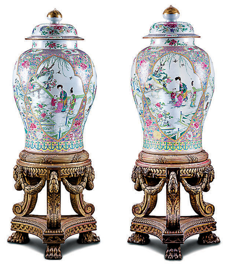 而瓷器作為古代重要的藝術表達手段,除了一些富有吉祥寓意的紋飾之外,亦會納入一些具有一定教化功能的主題,例如「教子圖」就為明清時期常見的瓷器裝飾題材,表達對女性賢良、家庭和睦、子女成才的祝願。筆者所收藏的一對「清雍正粉彩開光教子圖大蓋罐」,碩大的器身飾以滿地錦緞花紋,鼓腹以開光技法繪教子圖。