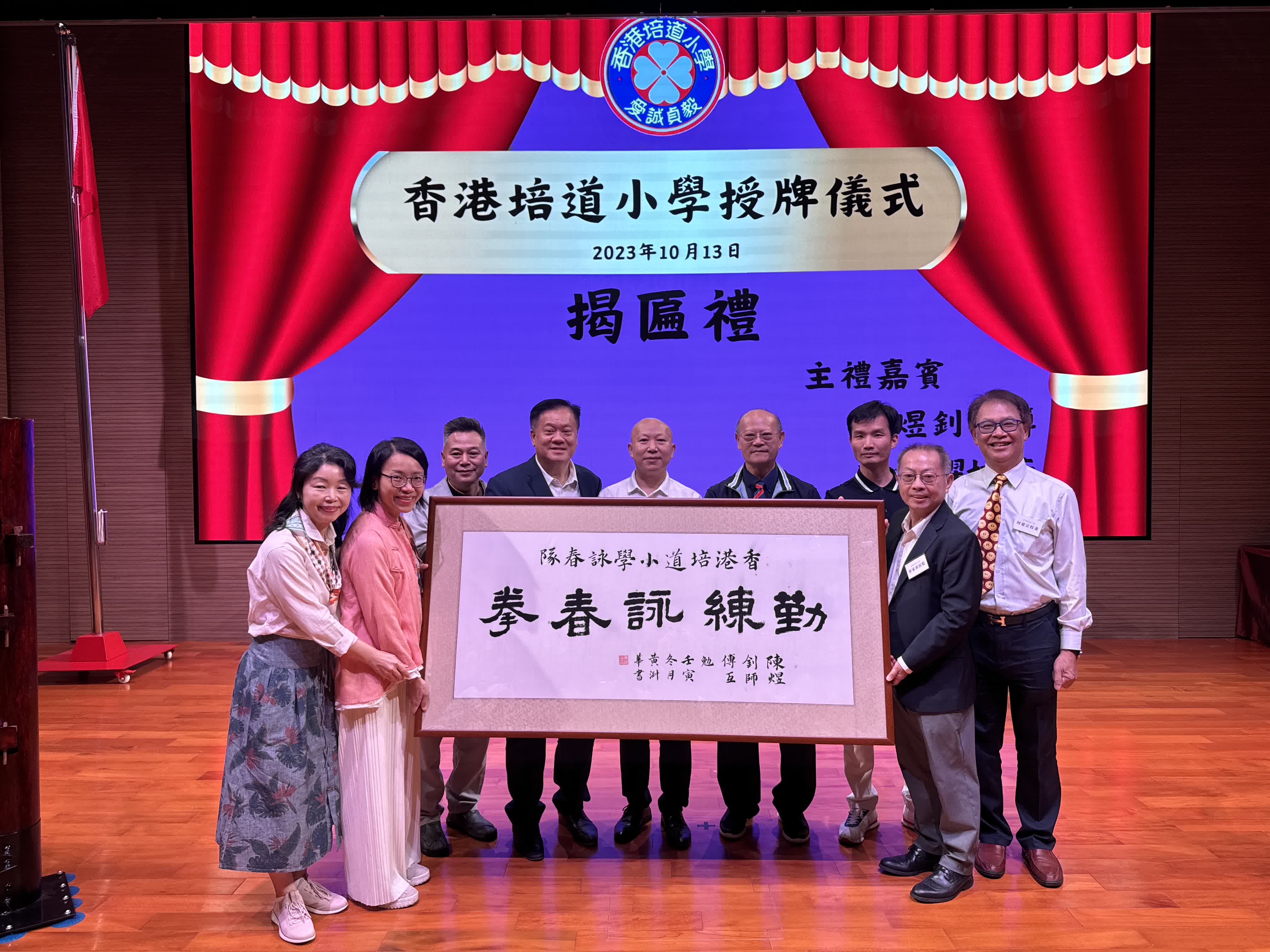 (香港文匯網記者 敖敏輝)10月13日,作為廣東省武術協會進校園系列的重點活動,港澳海外詠春拳進校園傳承基地揭牌儀式在香港培道小學舉行。至此,培道小學成為廣東省武術協會在香港的第一間「武術進校園示範單位」學校。記者了解到,詠春拳文化也是該校打造「和•正」理念的教育生態的重要組成部分,業界表示,本次活動對詠春拳在香港地區的傳播具有重要的意義。