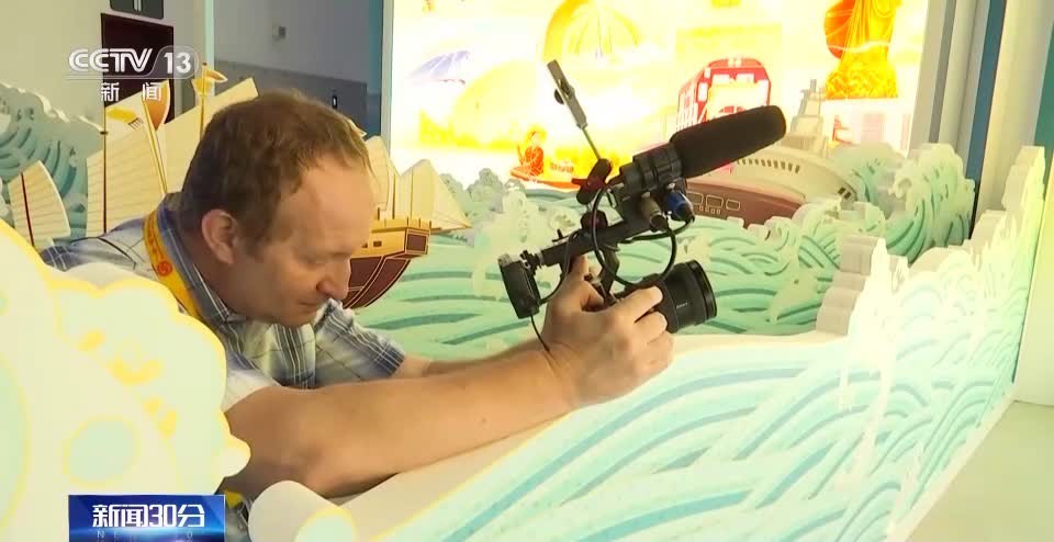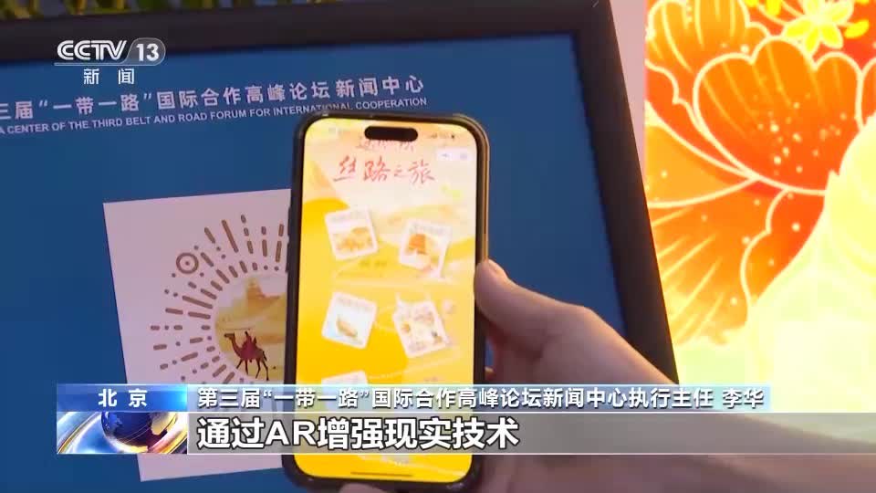 第三屆「一帶一路」國際合作高峰論壇新聞中心執行主任 李華:「書畫」中展示共建「一帶一路」國家地標建築和相關合作標誌性項目,記者朋友可以通過手機掃碼,通過AR增強現實技術,將古絲綢之路的場景疊加於書畫上。
