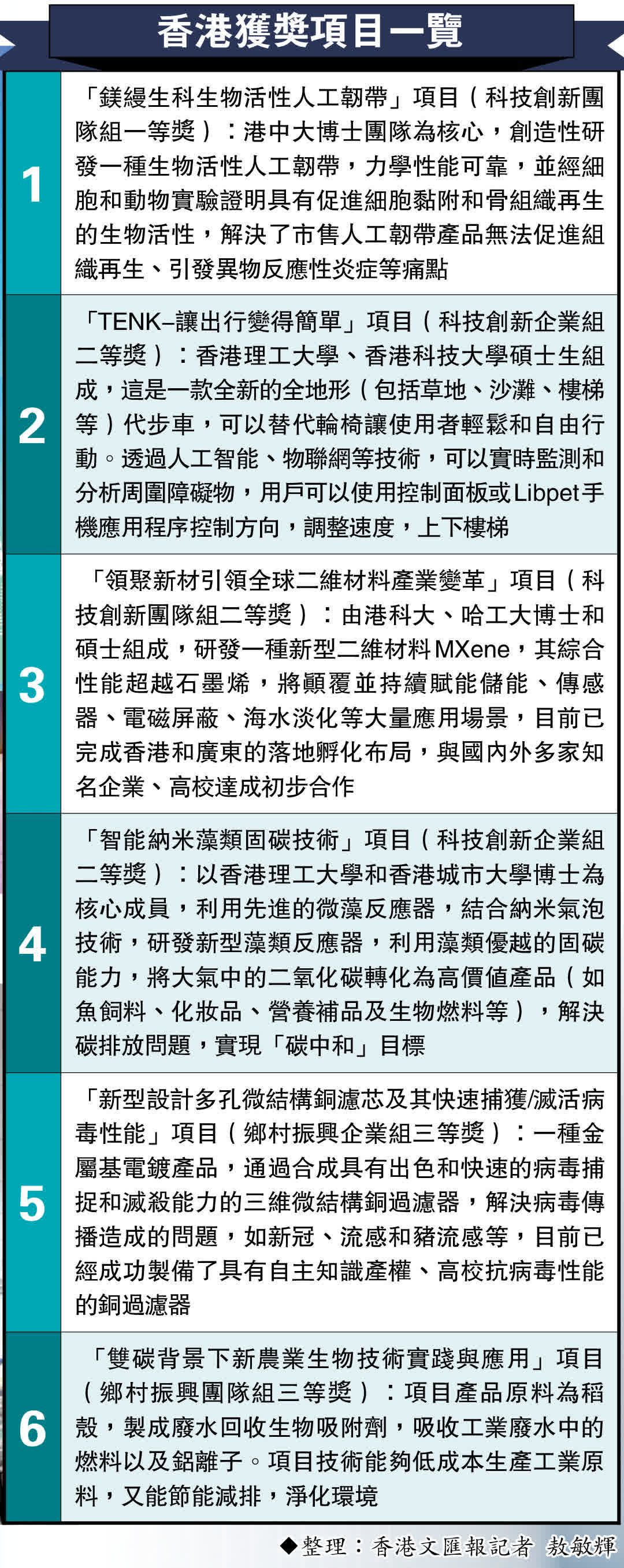 經過激烈角逐,大賽最終評選出一等獎6名,二等獎12名,三等獎18名。來自香港賽區的6個項目,分獲一二三等獎,分別涉及生物醫學、人工智能、環保、智能出行、新材料等多個前沿領域。