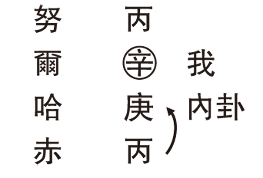 辛金是實務主義者,做認為該做的事情,思考邏輯細密,心直口快,遇強不吃眼前虧。而努爾哈赤姓名首字與尾字皆屬丙火,有自戀、自我感覺良好的特質,而丙火是理想主義者,內卦庚金屬陽,時常與人競爭,鬥爭也。