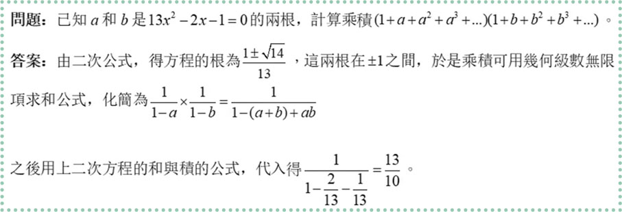 解題之中,大致都是用上幾何級數求和公式,之後用上二次公式和積公式,那就得到了答案,關鍵在於,開始時要懂檢查求和公式的條件。