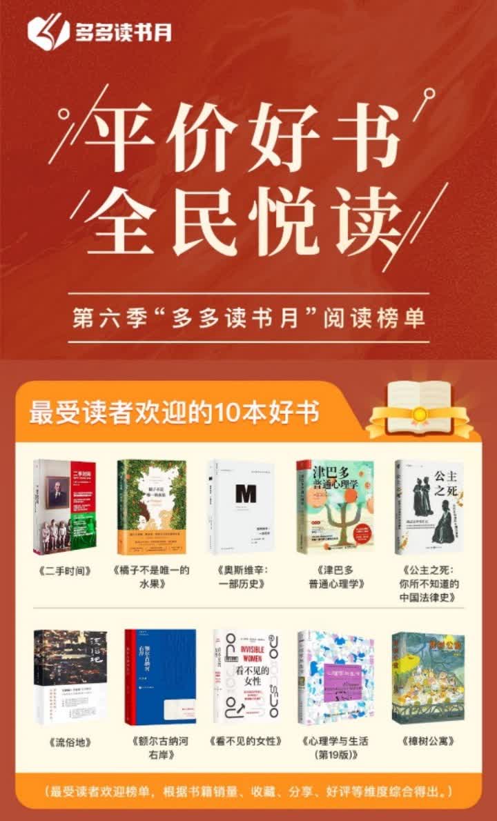 「多多讀書月」由新電商平台拼多多自2021年發起至今,陪伴讀者走過三年六季,累計補貼圖書2600餘萬冊,已逐漸成為圖書市場的一大IP。「本次『多多讀書月』關注當下社會思潮,從涵養普通人精神世界的角度,通過傾斜補貼資源,助力經典好書出圈,引導優質圖書消費。」拼多多相關負責人表示,今年以來,拼多多加速向高質量發展轉型,「多多讀書月」是平台推動圖書業務高質量發展的重要抓手。「通過完善正版平價好書的產銷鏈條,我們希望讓消費者與出版社兩頭受惠,提振圖書消費,推動行業實現有質量的增長。」