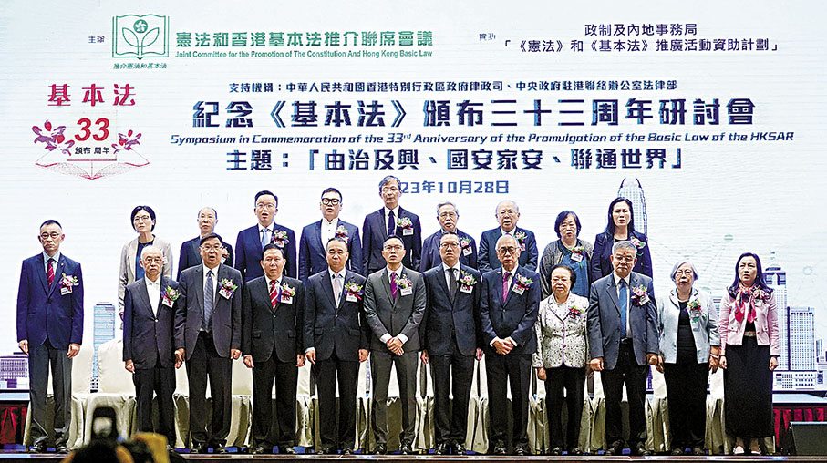 紀念基本法頒布三十三周年研討會由特區政府政制及內地事務局「基本法推廣資助計劃」贊助,律政司及中央政府駐港聯絡辦法律部支持。研討會以「由治及興、國安家安、聯通世界」為主題,特區政府官員、立法會議員、專家學者、法律界精英和青年學生等社會各界400餘人參加。中央政府駐港聯絡辦副主任劉光源擔任主禮嘉賓並致辭,律政司司長林定國擔任主禮嘉賓,與其他多名主講嘉賓在研討會上發表主題演講。