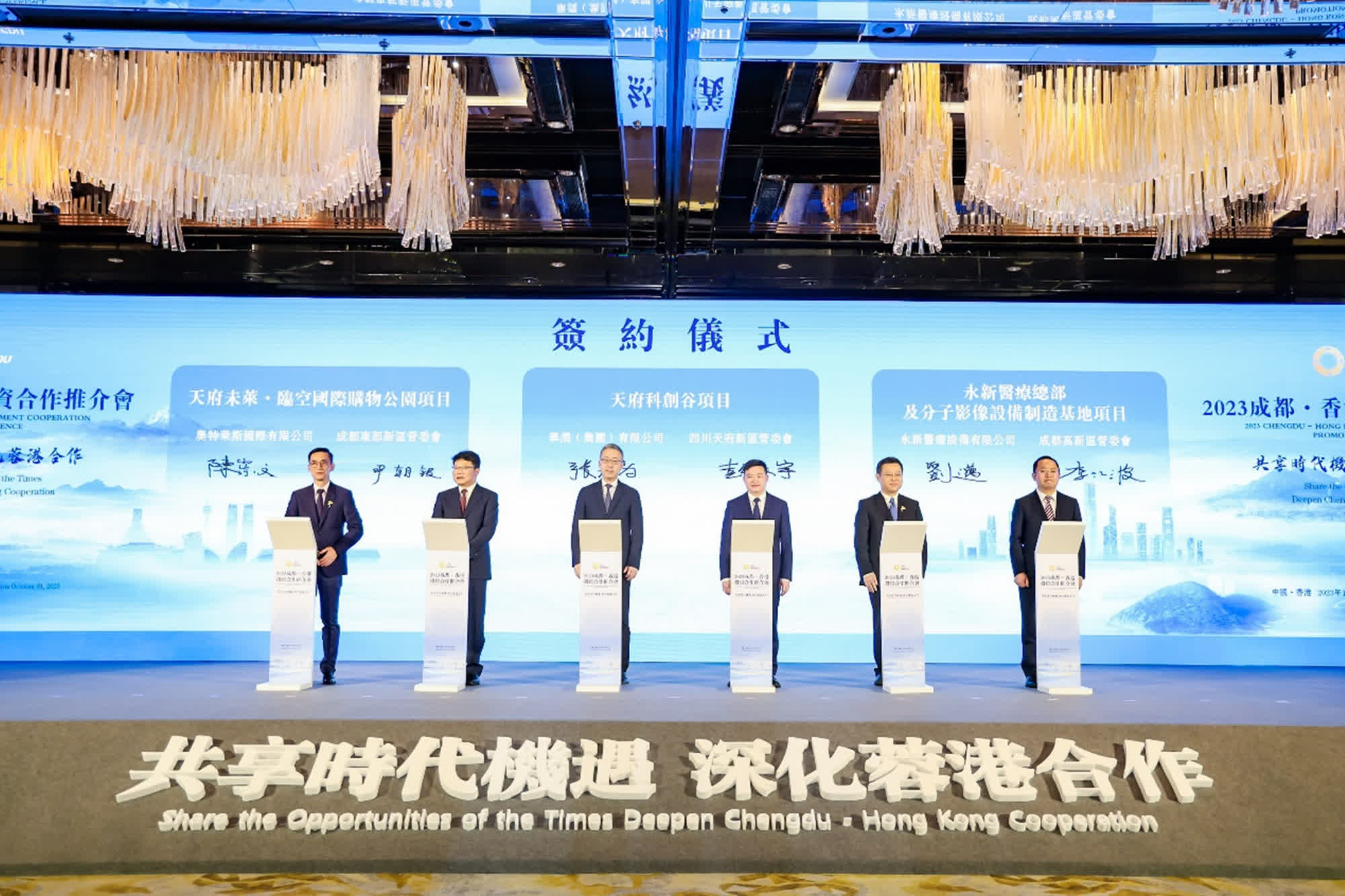 (香港文匯網記者李兵 成都報道)日前,以「共享時代機遇,深化蓉港合作——攜手共譜中國式現代化萬千氣象新篇章」為主題的成都—香港投資合作推介會在港舉行,四川天府新區、成都東部新區、成都高新區組團亮相,分別與華潤集團、奧萊國際、永新醫療等企業簽署協議,共同打造天府科創谷、天府未萊·臨空國際購物公園等3大重點蓉港合作項目,總投資額168億元(人民幣,下同)。