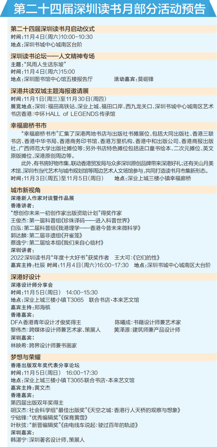 本屆讀書月以「共讀雙城」為主題,創新推出系列深港閱讀交流活動。接下來,幸福廊橋書市、深港設計師對話、深港新人作家對談暨作品展、深港青少年同誦古詩詞展演活動、香港出版雙年獎×深圳讀書月年度十大好書聯展等活動將輪番上演。