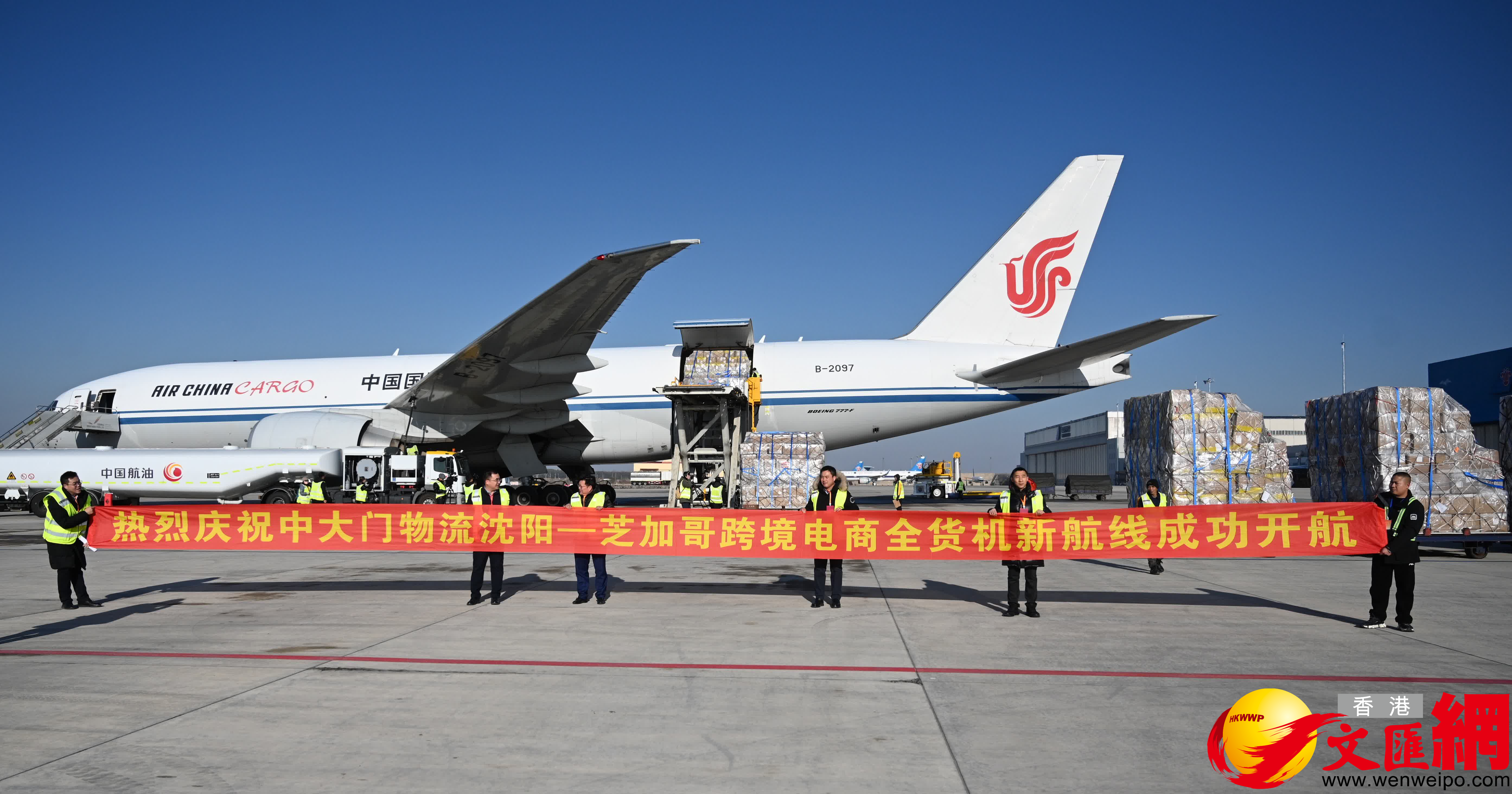 (香港文匯網記者 于珈琳)滿載着103噸來自中國廣東的衣服、鞋帽、手機殼等日用品和電子配件等跨境電商產品,瀋陽-芝加哥跨境電商全貨運新航線今日(13日)下午在瀋陽桃仙國際機場首航。歷經約15小時,這批跨境電商產品將在美國中部城市芝加哥落地,總貨值約3400萬元(人民幣,下同)。新航線穩定後,計劃每周執飛三班,每月將會對美國中東部出口提供近1200噸運力,並將實現瀋陽對北美航空貨運的全覆蓋。航線運營方之一、盛大門(瀋陽)跨境電商服務有限公司總經理吳堅強在接受記者採訪時介紹,這一航線的貨物多為來自廣東等粵港澳大灣區的跨境電商產品,品類包括服飾鞋帽、五金工具、電子產品、手機配件以及工業用品等,開通後將為「南貨北上」飛赴北美地區節省至少2小時的運輸時效。