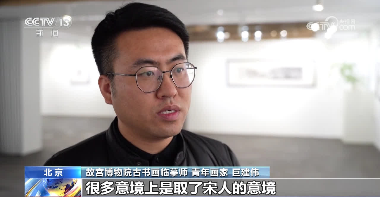 故宮博物院古書畫臨摹師 青年畫家 巨建偉:我畫的人物畫,很多包括花鳥畫,很多意境上是取了宋人的意境,技法上又用了元代以後文人畫的技法,所以在線的質感上,在用線的方法上,也能夠承載更多的情感。想通過這樣沒有顏色的,而且是水墨單純表現的語言內,然後表現出一種高度協調的、和諧的、理想的一種自然下的環境。