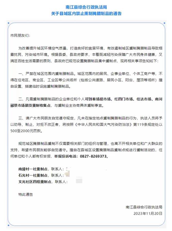 11月15日,通江縣綜合行政執法局聯合巴中市環保局、相關街道辦、新區管委會,發布了《關於在通江縣城區集中熏製臘製品的通告》。通告表示,「隨着熏製臘製品高峰期到來,熏製產生的煙塵將污染空氣,影響市民生產、生活,並存在火災安全隱患。為尊重傳統、方便市民,同時保護生態環境、保障熏製安全,根據有關規定,禁止在縣城區農貿市場、居民小區院內、樓道、陽台、屋頂以及岩坡旁、路邊、河溝等非指定地點熏製臘製品;禁止在縣城區內擅自搭建臘製品熏製設施;縣城區臘製品實行定點集中熏製。」