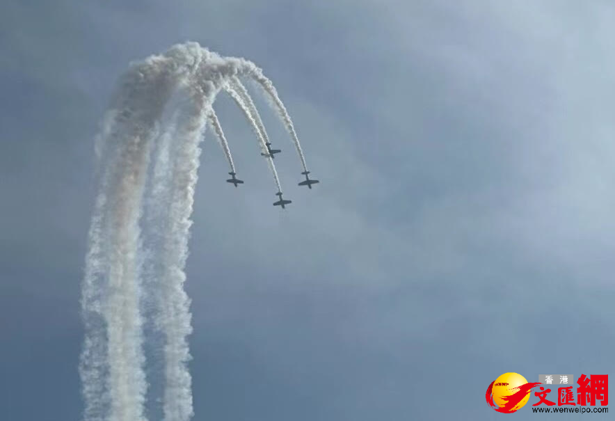 首次來華進行「首秀」的歐洲「穿越騎士」特技飛行表演隊精心編排單機Solo、雙機編隊、四機編隊的失速倒轉、蝴蝶筋鬥、鏡像飛行、雙機對沖等多種特技動作,還為現場觀眾獻上浪漫的「雙愛心」。