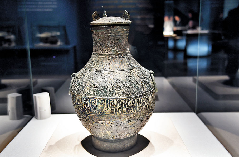 據悉,這件戰國狩獵紋銅壺高40餘厘米,銅壺的主題圖案有羽人仙鶴圖、狩獵圖、三足鳥向日圖等,描繪了人們手持武器,與獵物進行激烈對抗的場景。無論是狩獵場景、人物形象,還是動物形態,都被刻畫得精細入微、栩栩如生,整個壺身由下至上,似乎是整個戰國時代蜀人生活的縮影。