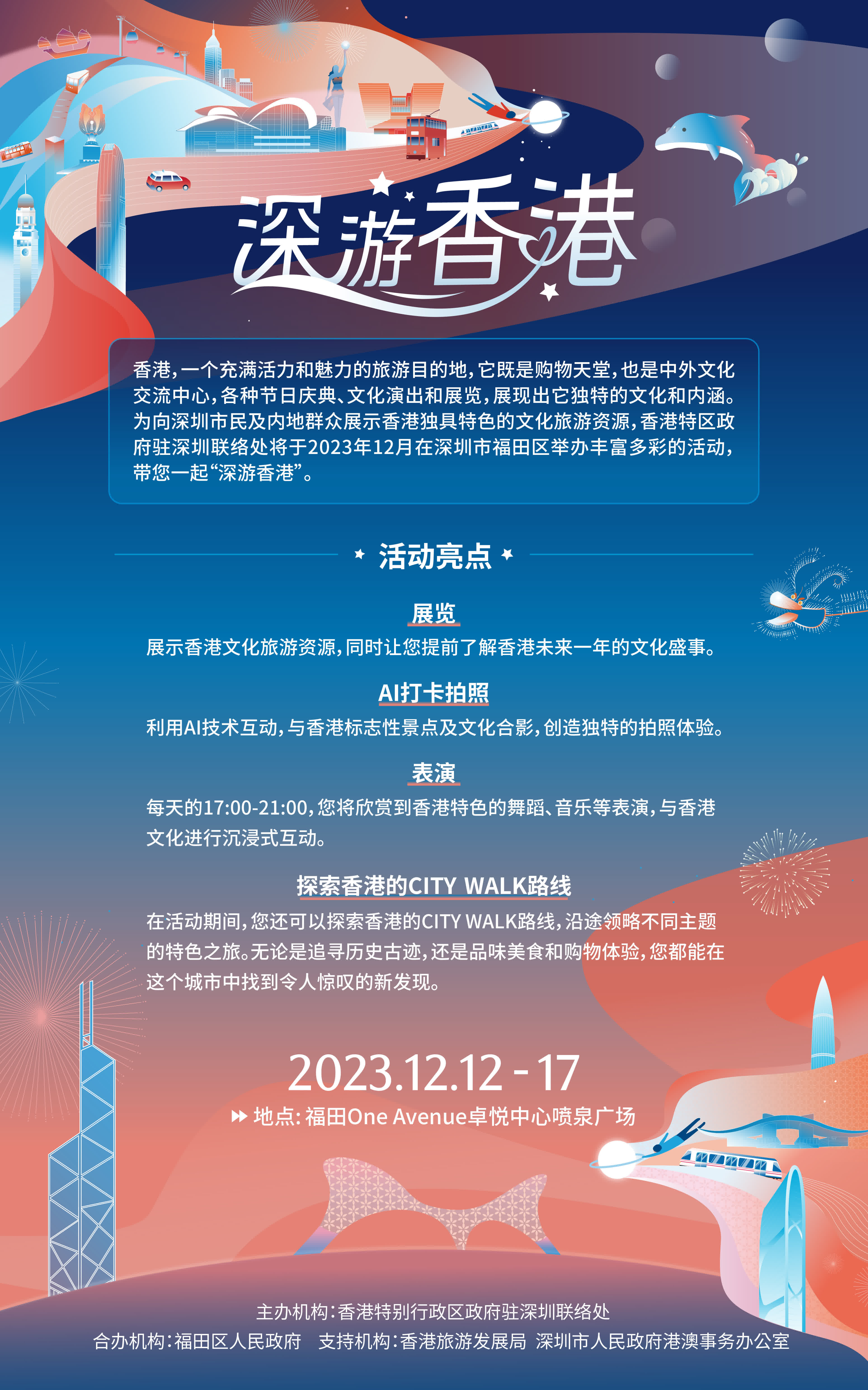 (香港文匯網記者 胡永愛)12月12日-17日,香港特區政府駐深圳聯絡處將在深圳市福田區One Avenue卓悅中心噴泉廣場舉辦「深游香港」文化旅遊推廣活動。