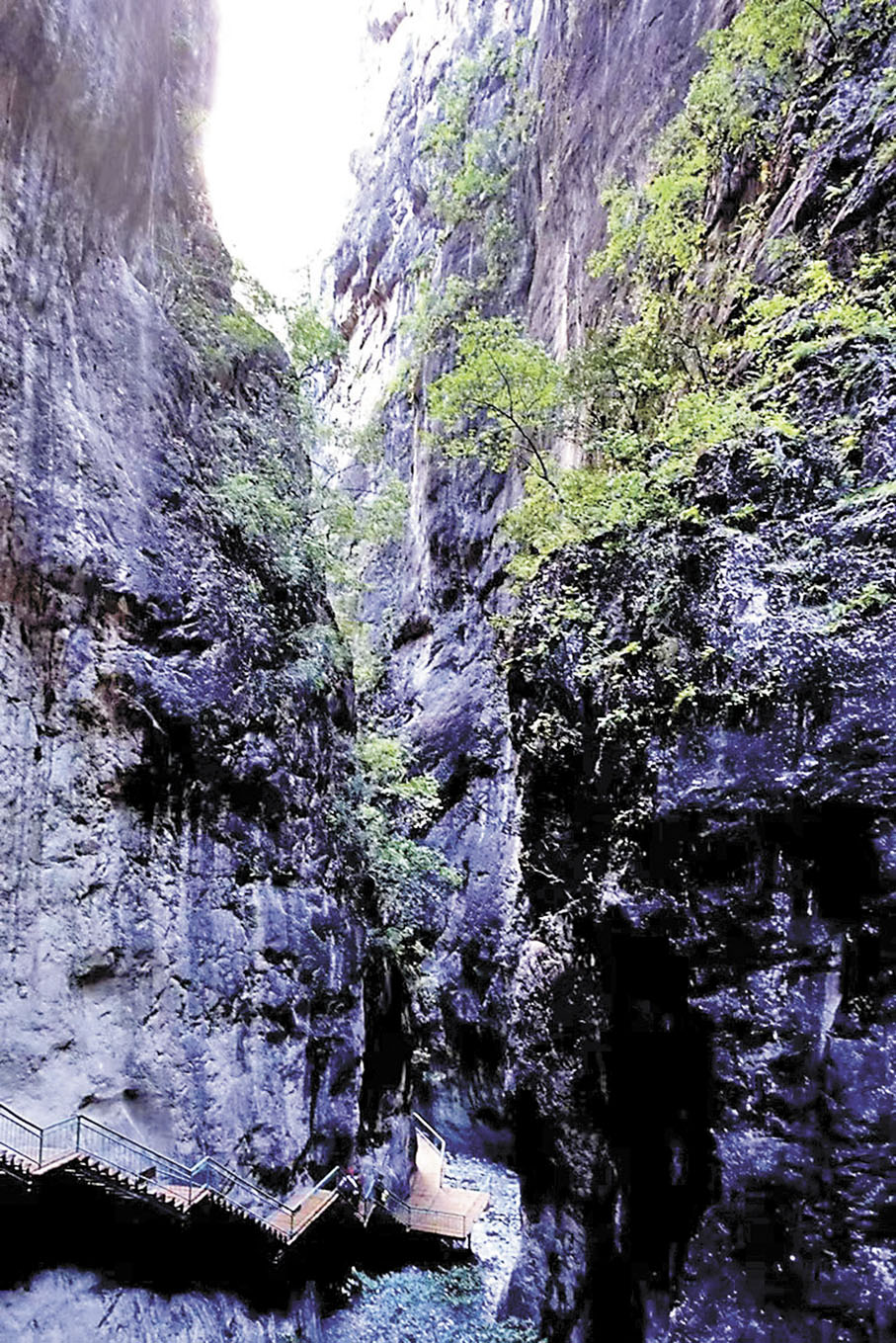 側谷支峽中最險峻神秘的是通天峽。通天峽,藏語稱「德金卡」,是由巴拉格宗冰川雪水融化形成的河流沿地層斷裂縫經過千百萬年沖刷切割而成的。從谷底至峽頂約4,000米,峽谷呈U字形,對面兩山體距離相近,懸崖絕壁成垂簾狀,高達千米,直聳雲天。從谷底抬頭仰望天空,峽谷的夾縫如被一道利劍劈開,兩邊懸崖撐着一線青天,因而當地人也將這裏稱為一線天。在通天峽內,沿路會看到許多綠色的石頭,被稱為冰角綠岩,是經過成千上萬年的洗禮才形成的冰川岩石。這些綠岩下面的地底深處,暗河一年四季都在不停湧動。通天峽可以直通格宗神山,一條神秘的峽谷,一段絕美的通天路,感受人與自然的和諧共生。峽谷之上,時而一輪紅日懸在碧藍的天空中,映襯的雲朵更加潔白無瑕;時而有陽光灑在雲霧裊繞的峽谷內,雲蒸霞蔚。不遠處,還有自然形成的、如佛塔一般的雪山,在霞光的照耀下,宛如神邸。峽谷中最耀眼的是谷底一條碧綠如玉般的通天河—崗曲河,她是巴拉村的母親河,活化了大峽谷,令大峽谷靈氣十足。
